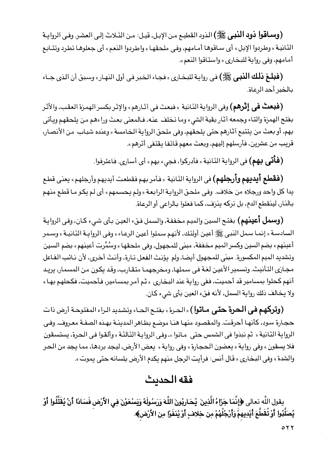 (فقطع أيديهم وأرجلهم) في الرواية الثانية "فأمر بهم فقطعت أيديهم وأرجلهم" يعني قطع يدا كل واحد ورجلاه من خلاف. وفي ملحق الرواية الرابعة "ولم يحسمهم" أي لم يكو ما قطع منهم بالنار، لينقطع الدم، بل تركه ينزف، كما فعلوا بالراعي أو الرعاة.