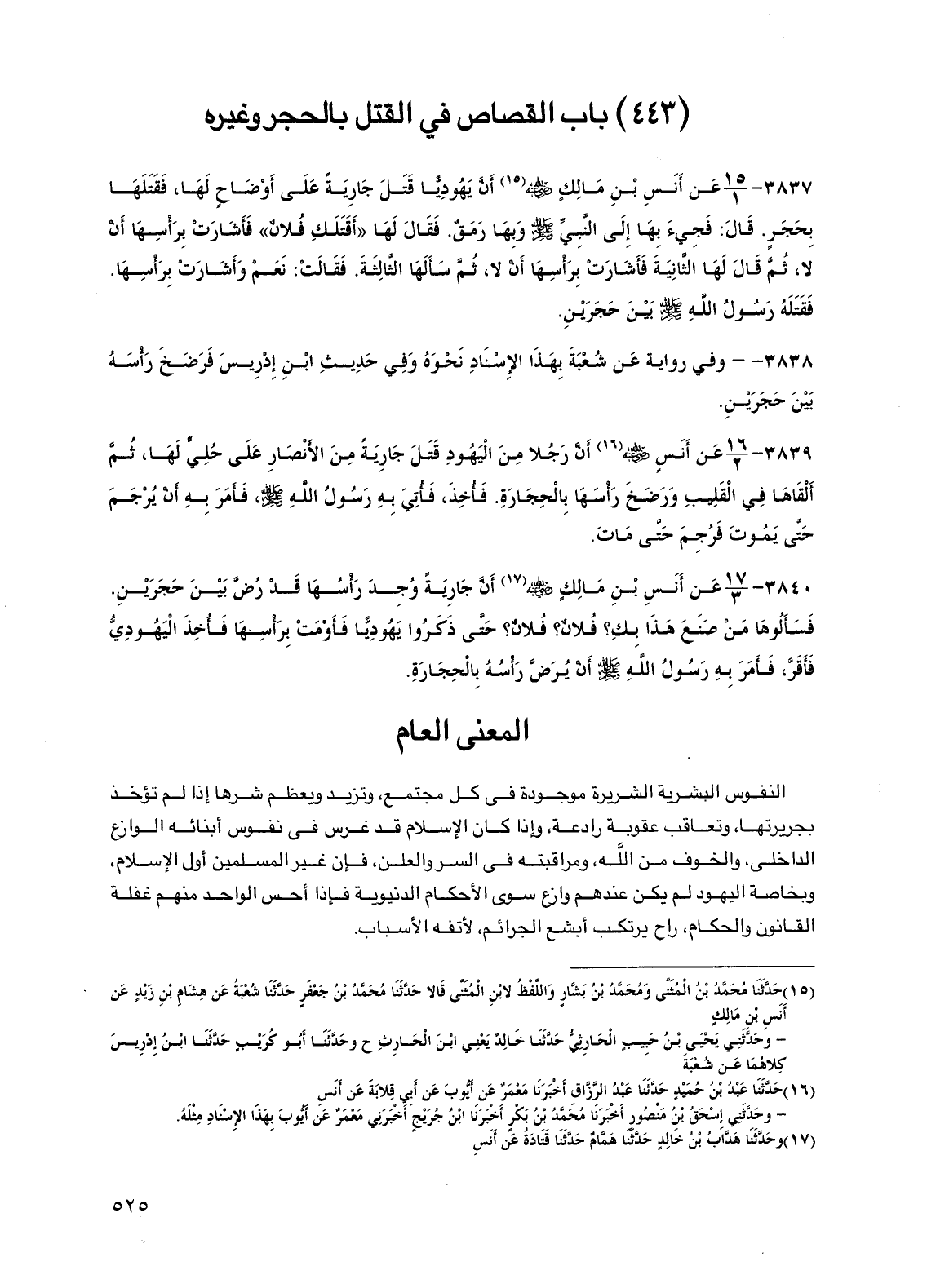 3837 - عن أنس بن مالك رضي الله عنه أن يهوديًا قتل جارية على أوضاح لها، فقتلها بحجر. قال: فجيء بها إلى النبي صلى الله عليه وسلم وبها رمق. فقال لها "أقتلك فلان" فأشارت برأسها أن لا، ثم قال لها الثانية فأشارت برأسها أن لا، ثم سألها الثالثة. فقالت: نعم وأشارت برأسها. فقتله رسول الله صلى الله عليه وسلم بين حجرين.