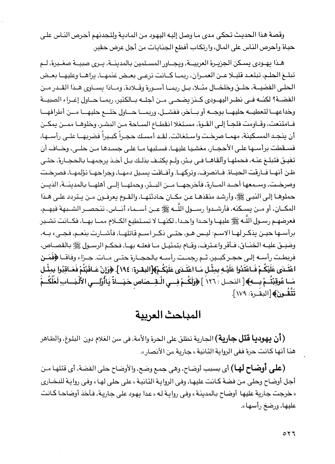 هذا يهودي يسكن الجزيرة العربية، ويجاور المسلمين بالمدينة، يرى صبية صغيرة، لم تبلغ الحلم، تبتعد قليلاً عن العمران، ربما كانت ترعى بعض غنمها، يراها وعليها بعض الحلي الفضية، حلق وخلخال مثلاً، بل ربما أسورة وقلادة، وماذا يساوي هذا القدر من الفضة؟ لكنه في نظر اليهودي كنز يضحي من أجله بالكثير، ربما حاول إغراء الصبية وخداعها لتعطيه حليها بوجه أو بآخر، ففشل، وربما حاول خلع حليها من أطرافها فامتنعت، وقاومت فلجأ إلى القوة، مستغلاً انقطاع الساحة من البشر، وخلوها ممن يمكن أن ينجد المسكينة، مهما صرخت واستغاثت، لقد أمسك حجرًا كبيرًا فضربها على رأسها، فسقطت برأسها على الأحجار، مغشيًا عليها، فسلبها ما على جسدها من حلي، وخاف أن تفيق فتبلغ عنه، فحملها وألقاها في بئر، ولم يكتف بذلك بل أخذ يرجمها بالحجارة، حتى ظن أنها فارقت الحياة. فانصرف، وتركها. وأفاقت يسيل دمها، وجراحها تؤلمها، فصرخت وصرخت، وسمعها أحد المارة، فأخرجها من البئر، وحملها إلى أهلها بالمدينة، الذين حملوها إلى النبي صلى الله عليه وسلم، وأرشد منقذها عن مكان حادثتها، والقوم يعرفون من يتردد على هذا المكان، أو من يسكنه، فأرشدوا رسول الله صلى الله عليه وسلم عن أسماء أناس، تنحصر الشبهة فيهم، فعرضهم رسول الله صلى الله عليه وسلم عليها واحدًا واحدًا، لكنها لا تستطيع الكلام مما بها، فكانت تشير برأسها حين يذكر لها الاسم: ليس هو، حتى ذكر اسم قاتلها، فأشارت بنعم، فجيء به، وضيق عليه الخناق، فأقر وأعترف، وقام بتمثيل ما فعله بها، فحكم الرسول صلى الله عليه وسلم بالقصاص، فربطت رأسه إلى حجر كبير، ثم رجمت رأسه بالحجارة حتى مات. جزاء وفاقا {فمن اعتدى عليكم فاعتدوا عليه بمثل ما اعتدى عليكم} [البقرة: 194].