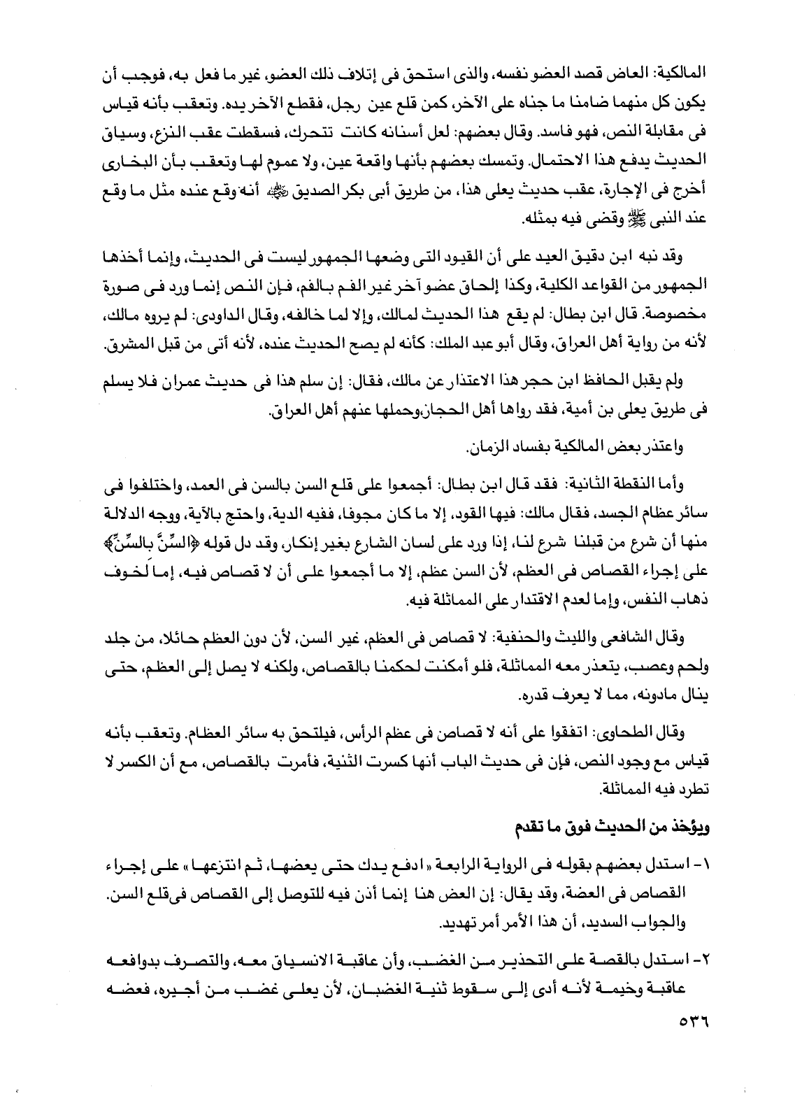 وأما النقطة الثانية: فقد قال ابن بطال: أجمعوا على قلع السن بالسن في العمد، واختلفوا في سائر عظام الجسد، فقال مالك: فيها القود، إلا ما كان مجوفًا، ففيه الدية، واحتج بالآية، ووجه الدلالة منها أن شرع من قبلنا شرع لنا، إذا ورد على لسان الشارع بغير إنكار، وقد دل قوله (السن بالسن) على أجراء القصاص في العظم، لأن السن عظم، إلا ما أجمعوا على أن لا قصاص فيه، إما لخوف ذهاب النفس، وإما لعدم الاقتدار على المماثلة فيه.