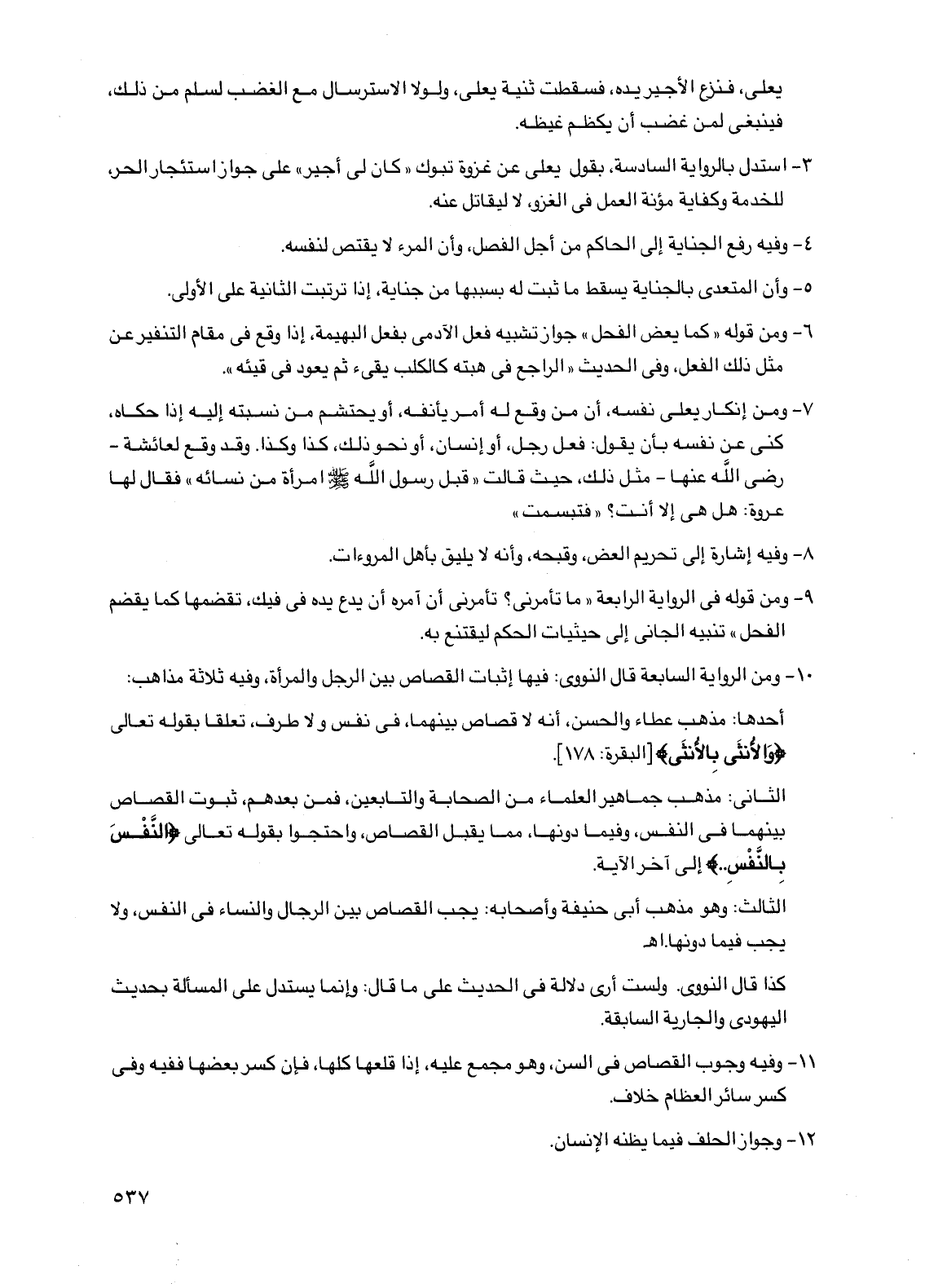 10 - ومن الرواية السابعة قال النووي: فيها إثبات القصاص بين الرجل والمرأة، وفيه ثلاثة مذاهب: أحدها: مذهب عطاء والحسن، أنه لا قصاص بينهما، في نفس ولا طرف، تعلقا بقوله تعالى {والأنثى بالأنثى} [البقرة: 178].