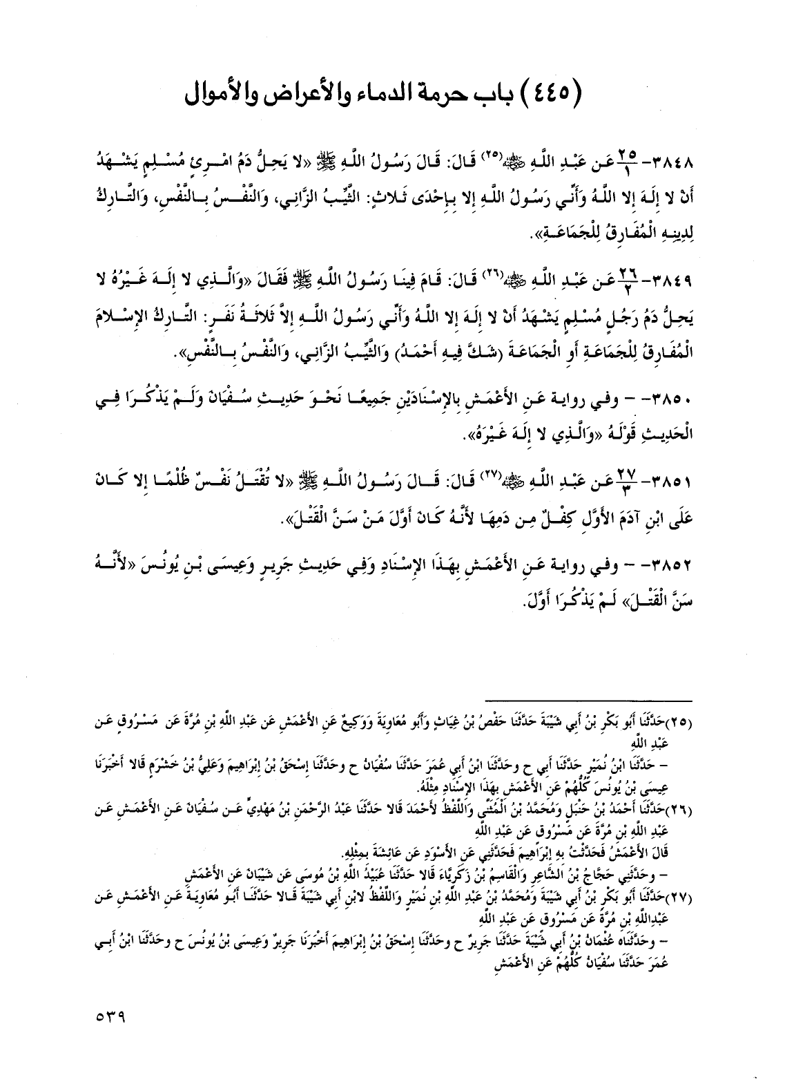 3849 - عن عبد الله رضي الله عنه قال: قام فينا رسول الله صلى الله عليه وسلم فقال "والذي لا إله غيره لا يحل دم رجل مسلم يشهد أن لا إله إلا الله وأني رسول الله إلا ثلاثة نفر: التارك الإسلام المفارق للجماعة أو الجماعة (شك فيه أحمد) والثيب الزاني، والنفس بالنفس".
