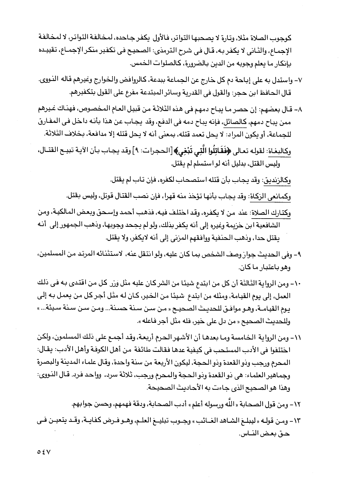 7 - واستدل به على إباحة دم كل خارج عن الجماعة ببدعة، كالروافض والخوارج وغيرهم قاله النووي. قال الحافظ ابن حجر: والقول في القدرية وسائر المبتدعة مفرع على القول بتكفيرهم.