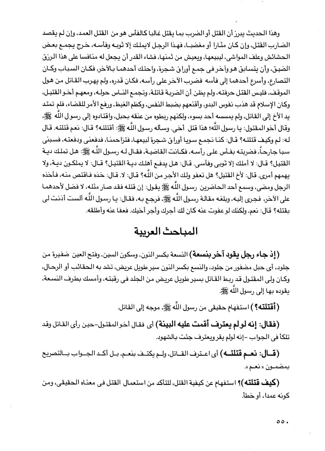(إذ جاء رجل يقود آخر بنسعة) النسعة بكسر النون، وسكون السين، وفتح العين ضفيرة من جلود، أي حبل مضفور من جلود، والنسع بكسر النون سير طويل عريض، تشد به الحقائب أو الرحال، وكان ولي المقتول قد ربط القاتل بسير طويل عريض من الجلد في رقبته، وأمسك بطرف النسعة، يقوده بها إلى رسول الله صلى الله عليه وسلم.