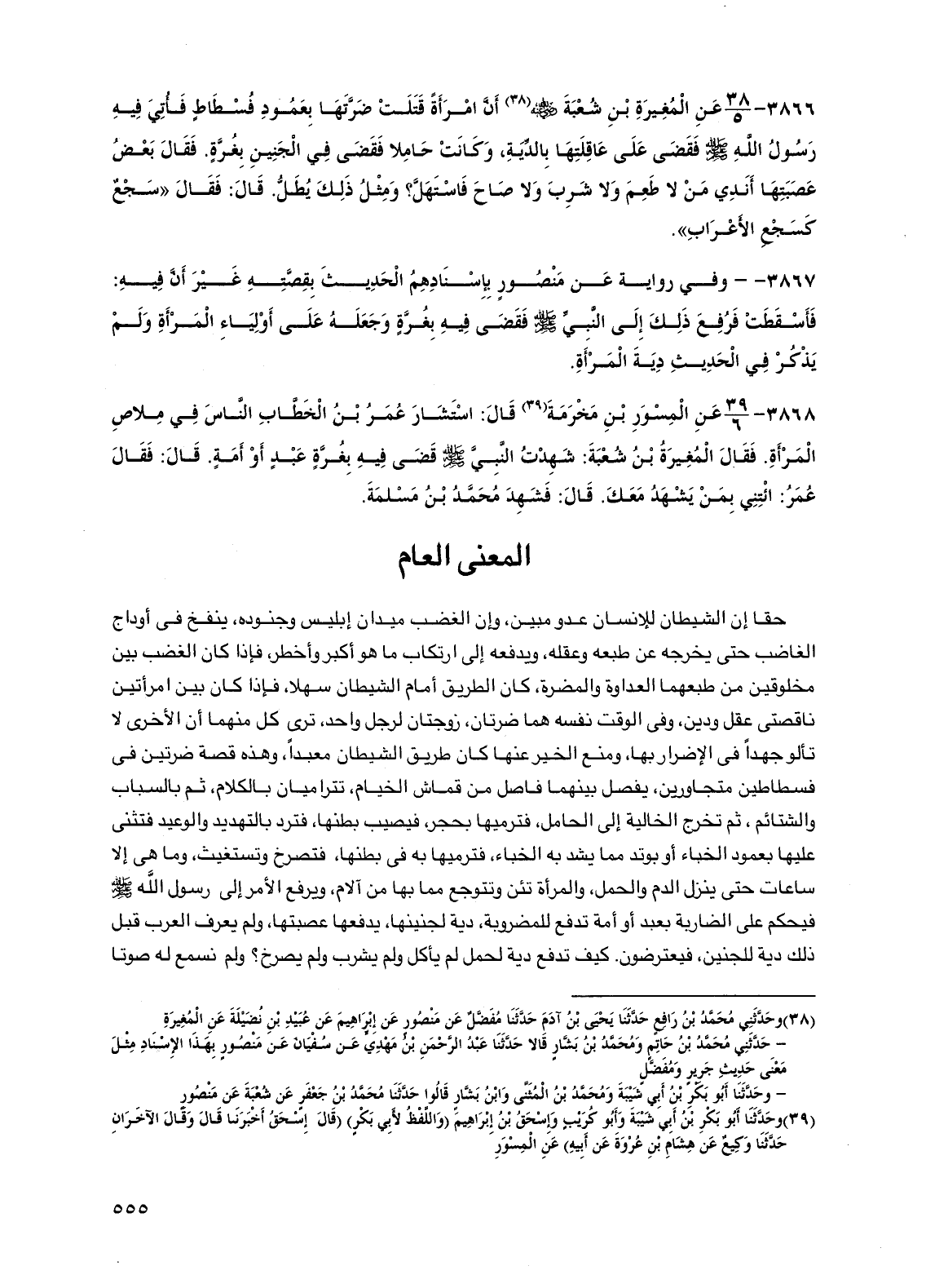 3866 - عن المغيرة بن شعبة رضي الله عنه أن امرأة قتلت ضرتها بعمود فسطاط فأتي فيه رسول الله صلى الله عليه وسلم فقضى على عاقلتها بالدية، وكانت حاملاً فقضى في الجنين بغرة. فقال بعض عصبتها أندي من لا طعم ولا شرب ولا صاح فاستهل؟ ومثل ذلك يطل. قال: فقال "سجع كسجع الأعراب".