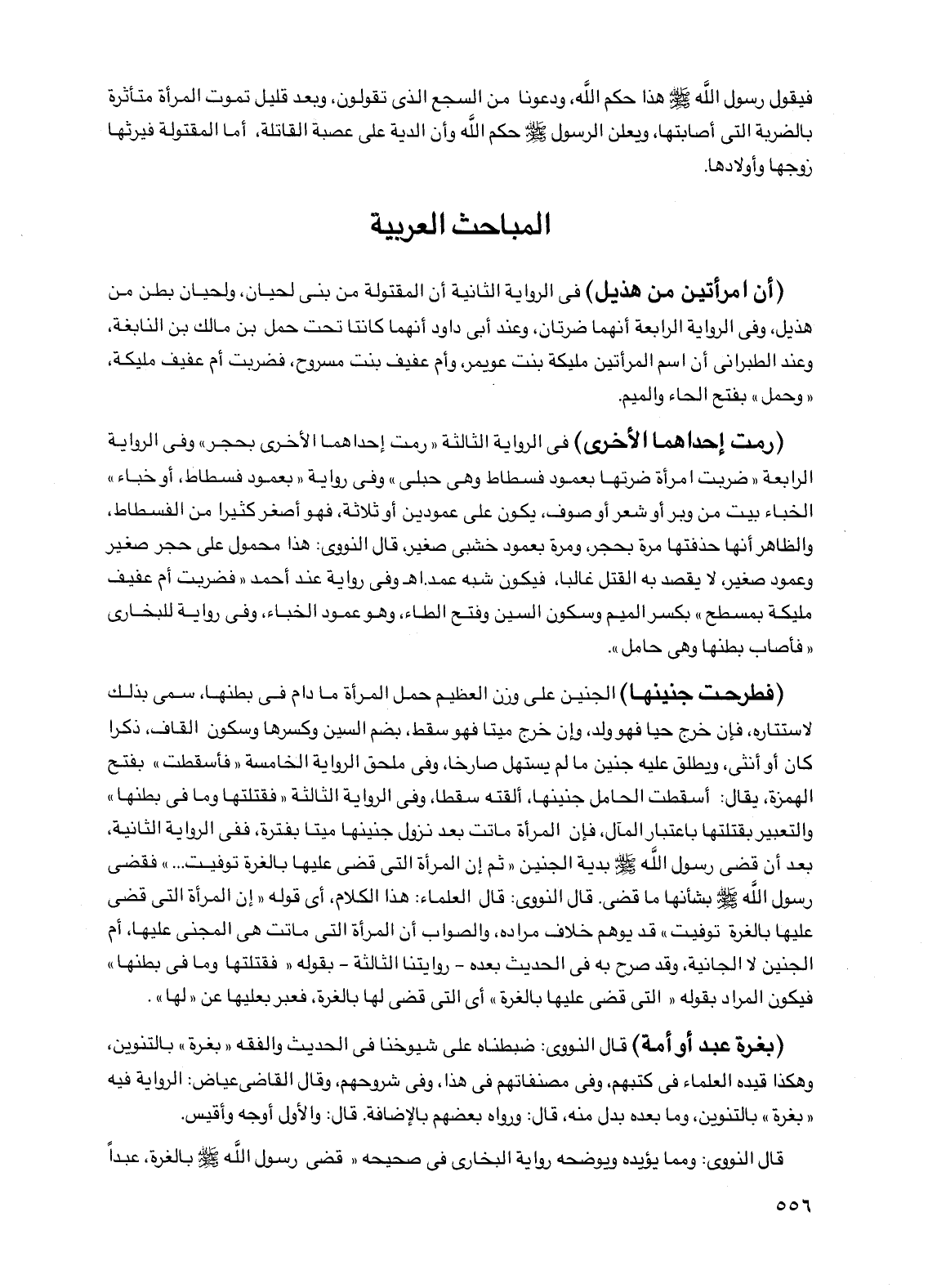 (فطرحت جنينها) الجنين على وزن العظيم حمل المرأة مادام في بطنها، سمي بذلك لاستتاره، فإن خرج حيًا فهو ولد، وإن خرج ميتًا فهو سقط، بضم السين وكسرها وسكون القاف، ذكرًا كان أو أنثى، ويطلق عليه جنين ما لم يستهل صارخًا، وفي ملحق الرواية الخامسة "فأسقطت" بفتح الهمزة، يقال: أسقطت الحامل جنينها، ألقته سقطًا، وفي الرواية الثالثة "فقتلتها وما في بطنها" والتعبير بقتلتها باعتبار المآل، فإن المرأة ماتت بعد نزول جنينها ميتًا بفترة، ففي الرواية الثانية، بعد أن قضى رسول الله صلى الله عليه وسلم بدية الجنين "ثم إن المرأة التي قضى عليها بالغرة توفيت ... " فقضى رسول الله صلى الله عليه وسلم بشأنها ما قضى. قال النووي: قال العلماء: هذا الكلام، أي قوله "إن المرأة التي قضى عليها بالغرة توفيت" قد يوهم خلاف مراده، والصواب أن المرأة التي ماتت هي المجني عليها، أم الجنين لا الجانية، وقد صرح به في الحديث بعده - روايتنا الثالثة - بقوله "فقتلتها وما في بطنها" فيكون المراد بقوله "التي قضى عليها بالغرة" أي التي قضى لها بالغرة، فعبر بعليها عن "لها".