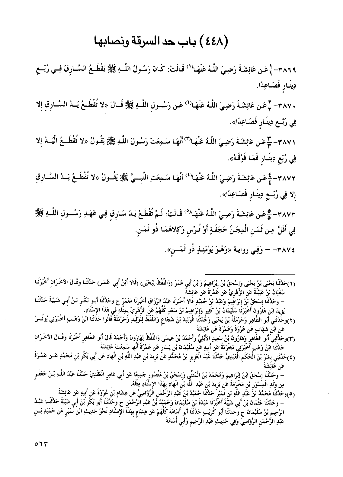 3872 - عن عائشة رضي الله عنها أنها سمعت النبي صلى الله عليه وسلم يقول "لا تقطع يد السارق إلا في ربع دينار فصاعدًا".