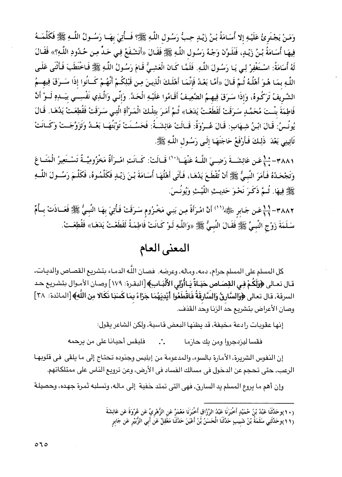 3882 - عن جابر رضي الله عنه أن امرأة من بني مخزوم سرقت فأتي بها النبي صلى الله عليه وسلم فعاذت بأم سلمة زوج النبي صلى الله عليه وسلم فقال النبي صلى الله عليه وسلم "والله لو كانت فاطمة لقطعت يدها" فقطعت.