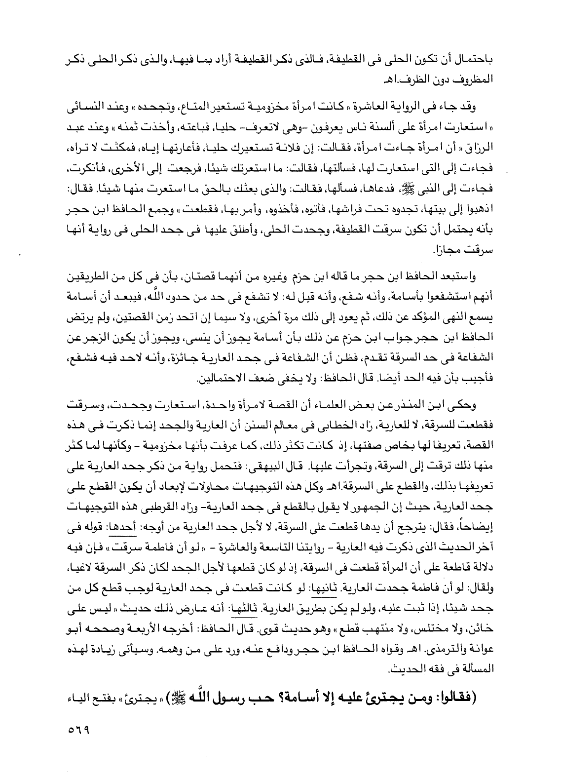 واستبعد الحافظ ابن حجر ما قاله ابن حزم وغيره من أنهما قصتان، بأن في كل من الطريقين أنهم استشفعوا بأسامة، وأنه شفع، وأنه قيل له: لا تشفع في حد من حدود الله، فيبعد أن أسامة يسمع النهي المؤكد عن ذلك، ثم يعود إلى ذلك مرة أخرى، ولا سيما إن اتحد زمن القصتين، ولم يرتض الحافظ ابن حجر جواب ابن حزم عن ذلك بأن أسامة يجوز أن ينسى، ويجوز أن يكون الزجر عن الشفاعة في حد السرقة تقدم، فظن أن الشفاعة في جحد العارية جائزة، وأنه لا حد فيه فشفع، فأجيب بأن فيه الحد أيضًا. قال الحافظ: ولا يخفى ضعف الاحتمالين.