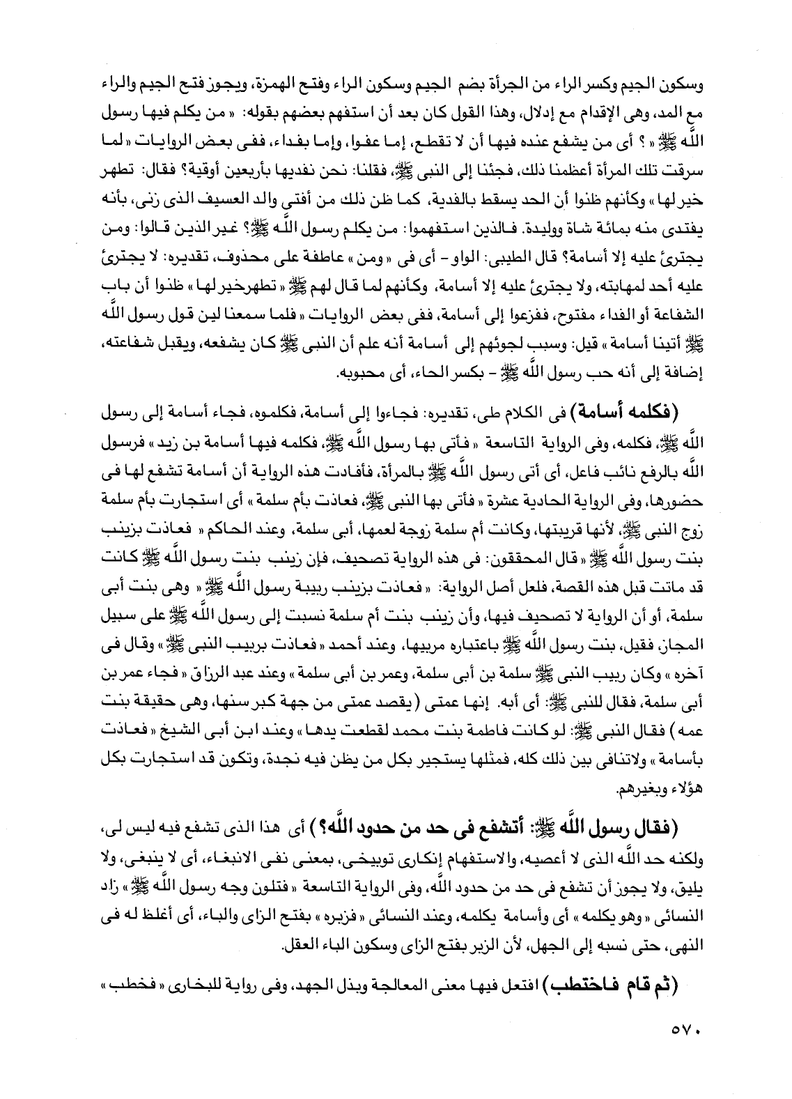 (فكلمه أسامة) في الكلام طي، تقديره: فجاءوا إلى أسامة، فكلموه، فجاء أسامة إلى رسول الله صلى الله عليه وسلم، فكلمه، وفي الرواية التاسعة "فأتى بها رسول الله صلى الله عليه وسلم، فكلمه فيها أسامة بن زيد" فرسول الله بالرفع نائب فاعل، أي أتى رسول الله صلى الله عليه وسلم بالمرأة، فأفادت هذه الرواية أن أسامة تشفع لها في حضورها، وفي الرواية الحادية عشرة "فأتى بها النبي صلى الله عليه وسلم، فعاذت بأم سلمة" أي استجارت بأم سلمة زوج النبي صلى الله عليه وسلم، لأنها قريبتها، وكانت أم سلمة زوجة لعمها، أبي سلمة، وعند الحاكم "فعاذت بزينب بنت رسول الله صلى الله عليه وسلم" قال المحققون: في هذه الرواية تصحيف، فإن زينب بنت رسول الله صلى الله عليه وسلم كانت قد ماتت قبل هذه القصة، فلعل أصل الرواية: "فعاذت بزينب ربيبة رسول الله صلى الله عليه وسلم" وهي بنت أبي سلمة، أو أن الرواية لا تصحيف فيها، وأن زينب بنت أم سلمة نسبت إلى رسول الله صلى الله عليه وسلم على سبيل المجاز، فقيل، بنت رسول الله صلى الله عليه وسلم باعتباره مربيها، وعند أحمد "فعاذت بربيب النبي صلى الله عليه وسلم" وقال في آخره" وكان ربيب النبي صلى الله عليه وسلم سلمة بن أبي سلمة، وعمر بن أبي سلمة" وعند عبد الرزاق "فجاء عمر بن أبي سلمة، فقال للنبي صلى الله عليه وسلم: أي أبه. إنها عمتي (يقصد عمتي من جهة كبر سنها، وهي حقيقة بنت عمه) فقال النبي صلى الله عليه وسلم: لو كانت فاطمة بنت محمد لقطعت يدها" وعند ابن أبي الشيخ "فعاذت بأسامة" ولا تنافي بين ذلك كله، فمثلها يستجير بكل من يظن فيه نجدة، وتكون قد استجارت بكل هؤلاء وبغيرهم.