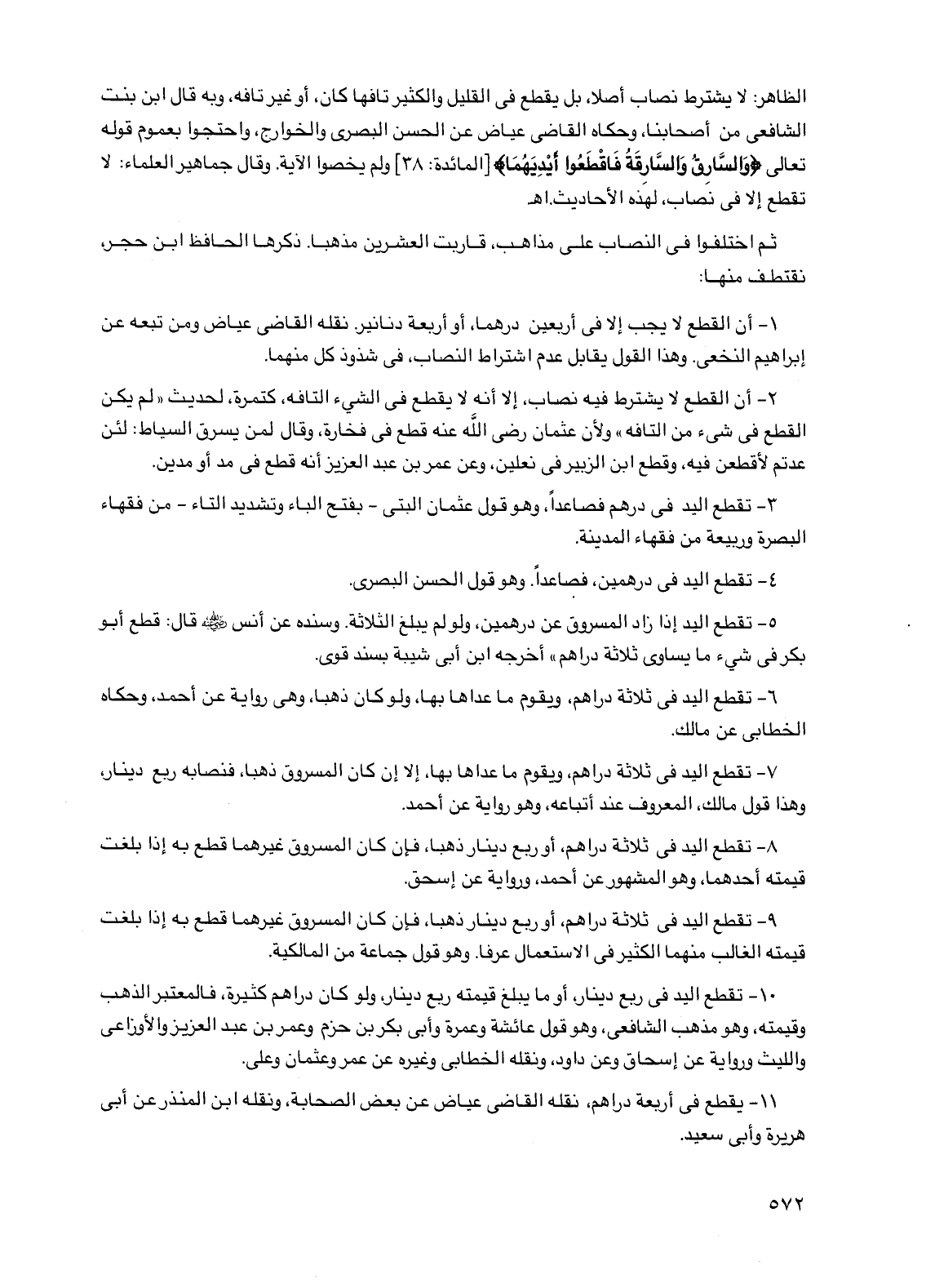 10 - تقطع اليد في ربع دينار، أو ما يبلغ قيمته ربع دينار، ولو كان دراهم كثيرة، فالمعتبر الذهب وقيمته، وهو مذهب الشافعي، وهو قول عائشة وعمرة وأبي بكر بن حزم وعمر بن عبد العزيز والأوزاعي والليث ورواية عن إسحاق وعن داود، ونقله الخطابي وغيره عن عمر وعثمان وعلي.