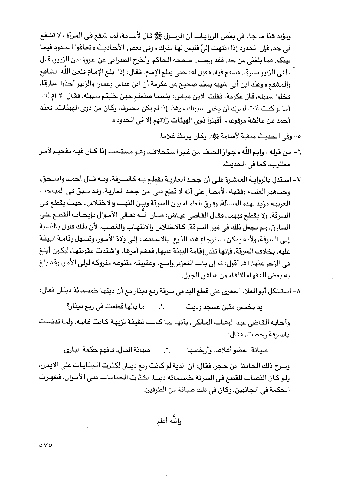 ويؤيد هذا ما جاء في بعض الروايات أن الرسول صلى الله عليه وسلم قال لأسامة، لما شفع في المرأة "لا تشفع في حد، فإن الحدود إذا انتهت إلي فليس لها مترك" وفي بعض الأحاديث "تعافوا الحدود فيما بينكم، فما بلغني من حد، فقد وجب" صححه الحاكم. وأخرج الطبراني عن عروة بن الزبير، قال "لقي الزبير سارقًا، فشفع فيه، فقيل له: حتى يبلغ الإمام. فقال: إذا بلغ الإمام فلعن الله الشافع والمشفع" وعند ابن أبي شيبة بسند صحيح عن عكرمة أن ابن عباس وعمارًا والزبير أخذوا سارقًا، فخلوا سبيله، قال عكرمة: فقلت لابن عباس: بئسما صنعتم حين خليتم سبيله. فقال: لا أم لك. أما لو كنت أنت لسرك أن يخلى سبيلك" وهذا إذا لم يكن محترفًا، وكان من ذوي الهيئات، فعند أحمد عن عائشة مرفوعًا "أقيلوا ذوي الهيئات زلاتهم إلا في الحدود".