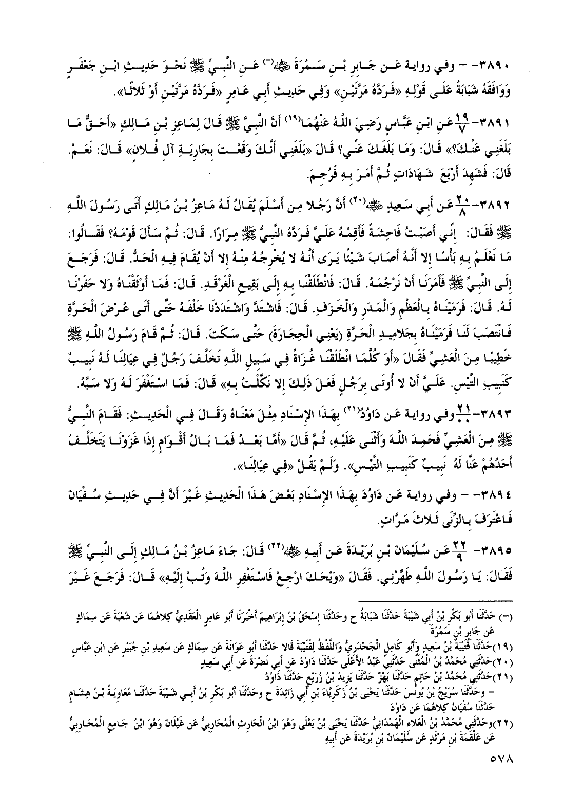 3891 - عن ابن عباس رضي الله عنهما أن النبي صلى الله عليه وسلم قال لماعز بن مالك "أحق ما بلغني عنك؟ " قال: وما بلغك عني؟ قال "بلغني أنك وقعت بجارية آل فلان" قال: نعم. قال: فشهد أربع شهادات ثم أمر به فرجم.