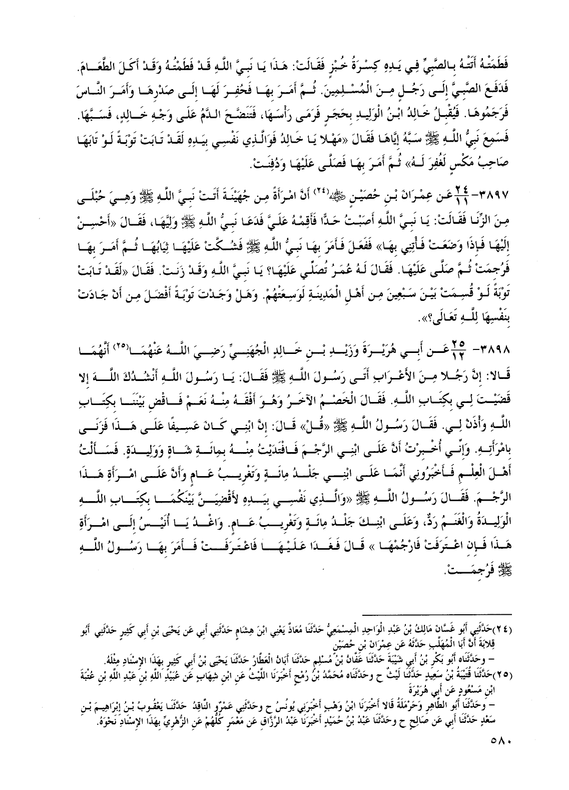 3898 - عن أبي هريرة وزيد بن خالد الجهني رضي الله عنهما أنهما قالا: إن رجلاً من الأعراب أتى رسول الله صلى الله عليه وسلم فقال: يا رسول الله أنشدك الله إلا قضيت لي بكتاب الله. فقال الخصم الآخر وهو أفقه منه نعم فاقض بيننا بكتاب الله وأذن لي. فقال رسول الله صلى الله عليه وسلم "قل" قال: إن ابني كان عسيفًا على هذا فزنى بامرأته. وإني أخبرت أن على ابني الرجم فافتديت منه بمائة شاة ووليدة. فسألت أهل العلم فأخبروني أنما على ابني جلد مائة وتغريب عام وأن على امرأة هذا الرجم. فقال رسول الله صلى الله عليه وسلم "والذي نفسي بيده لأقضين بينكما بكتاب الله الوليدة والغنم رد، وعلى ابنك جلد مائة وتغريب عام. واغد يا أنيس إلى امرأة هذا فإن اعترفت فارجمها" قال فغدا عليها فاعترفت فأمر بها رسول الله صلى الله عليه وسلم فرجمت.