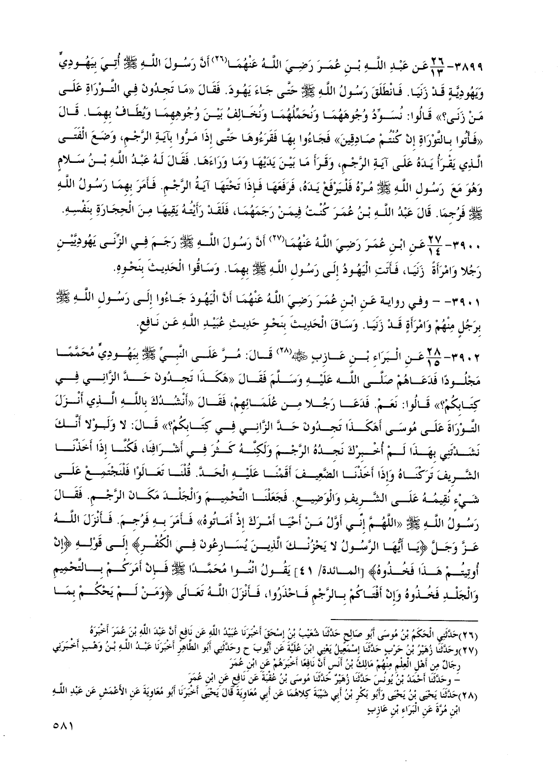 3899 - عن عبد الله بن عمر رضي الله عنهما أن رسول الله صلى الله عليه وسلم أتي بيهودي ويهودية قد زنيا. فانطلق رسول الله صلى الله عليه وسلم حتى جاء يهود. فقال "ما تجدون في التوراة على من زنى؟ " قالوا: نسود وجوههما ونحملهما ونخالف بين وجوههما ويطاف بهما. قال "فأتوا بالتوراة إن كنتم صادقين" فجاءوا بها فقرءوها حتى إذا مروا بآية الرجم. وضع الفتى الذي يقرأ يده على آية الرجم، وقرأ ما بين يديها وما وراءها. فقال له عبد الله بن سلام وهو مع رسول الله صلى الله عليه وسلم مره فليرفع يده، فرفعها فإذا تحتها آية الرجم. فأمر بهما رسول الله صلى الله عليه وسلم فرجما. قال عبد الله بن عمر كنت فيمن رجمهما، فلقد رأيته يقيها من الحجارة بنفسه.