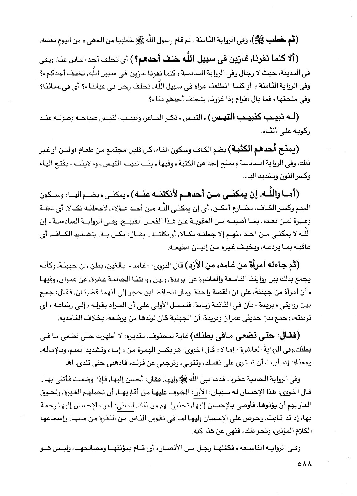 (ثم جاءته امرأة من غامد، من الأزد) قال النووي: "غامد" بالغين، بطن من جهينة، وكأنه يجمع بذلك بين روايتنا التاسعة والعاشرة عن بريدة، وبين روايتنا الحادية عشرة، عن عمران، وفيها "أن امرأة من جهينة، على أن القصة واحدة. ومال الحافظ ابن حجر إلى أنهما قضيتان، فقال: جمع بين روايتي "بريدة" بأن في الثانية زيادة، فتحمل الأولى على أن المراد بقوله "إلى رضاعه" أي تربيته، وجمع بين حديثي عمران وبريدة، أن الجهنية كان لولدها من يرضعه، بخلاف الغامدية.