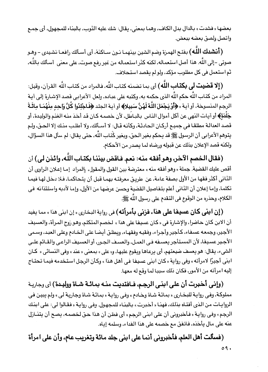 (فقال الخصم الآخر، وهو أفقه منه: نعم. فاقض بيننا بكتاب الله، وائذن لي) أن أقص عليك القضية. جملة "وهو أفقه منه" معترضة بين القول والمقول، والمراد إما إعلان الراوي أن الثاني أكثر فقهًا من الأول بصفة عامة، عن طريق معرفته بهما قبل أن يتحاكما، فلا دخل لها فيما تكلما، وإما إعلان أن الثاني أعلم بتفاصيل القضية وحسن عرضها من الأول، وإما لأدبه واستئذانه في الكلام، وحذره من الوقوع في التقدم على رسول الله صلى الله عليه وسلم.