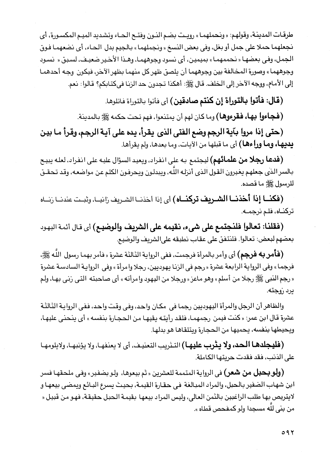 طرقات المدينة، وقولهم: "ونحملهما" رويت بضم النون وفتح الحاء وتشديد الميم المكسورة، أي نجعلهما حملاً على جمل أو بغل، وفي بعض النسخ "ونجملهما" بالجيم بدل الحاء، أي نضعهما فوق الجمل، وفي بعضها "نحممهما" بميمين، أي نسود وجوههما، وهذا الأخير ضعيف، لسبق "نسود وجوههما" وصورة المخالفة بين وجوههما أن يلصق ظهر كل منهما بظهر الآخر، فيكون وجه أحدهما إلى الأمام، ووجه الآخر إلى الخلف. قال صلى الله عليه وسلم: أهكذا تجدون حد الزنا في كتابكم؟ قالوا: نعم.