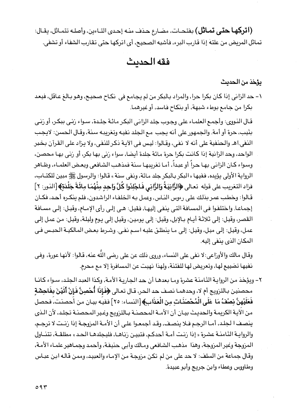 قال النووي: وأجمع العلماء على وجوب جلد الزاني البكر مائة جلدة، سواء زنى ببكر، أو زنى بثيب، حرة أو أمة. والجمهور على أنه يجب مع الجلد نفيه وتغريبه سنة، وقال الحسن: لا يجب النفي. اهـ. والحنفية على أنه لا نفي، وقالوا: ليس في الآية ذكر للنفي، ولا يزاد على القرآن بخبر الواحد، وحد الزانية إذا كانت بكرًا حرة مائة جلدة أيضًا، سواء زنى بها بكر، أو زنى بها محصن، وسواء كان الزاني بها حرًا أو عبدًا، أما تغريبها سنة فمذهب الشافعي وبعض العلماء، وظاهر الرواية الأولى يؤيده، ففيها "البكر بالبكر جلد مائة، ونفي سنة" قالوا: والرسول صلى الله عليه وسلم مبين للكتاب، فزاد التغريب على قوله تعالى {الزانية والزاني فاجلدوا كل واحد منهما مائة جلدة} [النور: 2] قالوا: وخطب عمر بذلك على رءوس الناس، وعمل به الخلفاء الراشدون، فلم ينكره أحد، فكان إجماعًا. واختلفوا في المسافة التي ينفى إليها، فقيل: هي إلى رأي الإمام، وقيل: إلى مسافة القصر، وقيل: إلى ثلاثة أيام بالإبل، وقيل: إلى يومين، وقيل إلى يوم وليلة، وقيل: من عمل إلى عمل، وقيل: إلى ميل، وقيل: إلى ما ينطلق عليه اسم نفي. وشرط بعض المالكية الحبس في المكان الذي ينفى إليه.