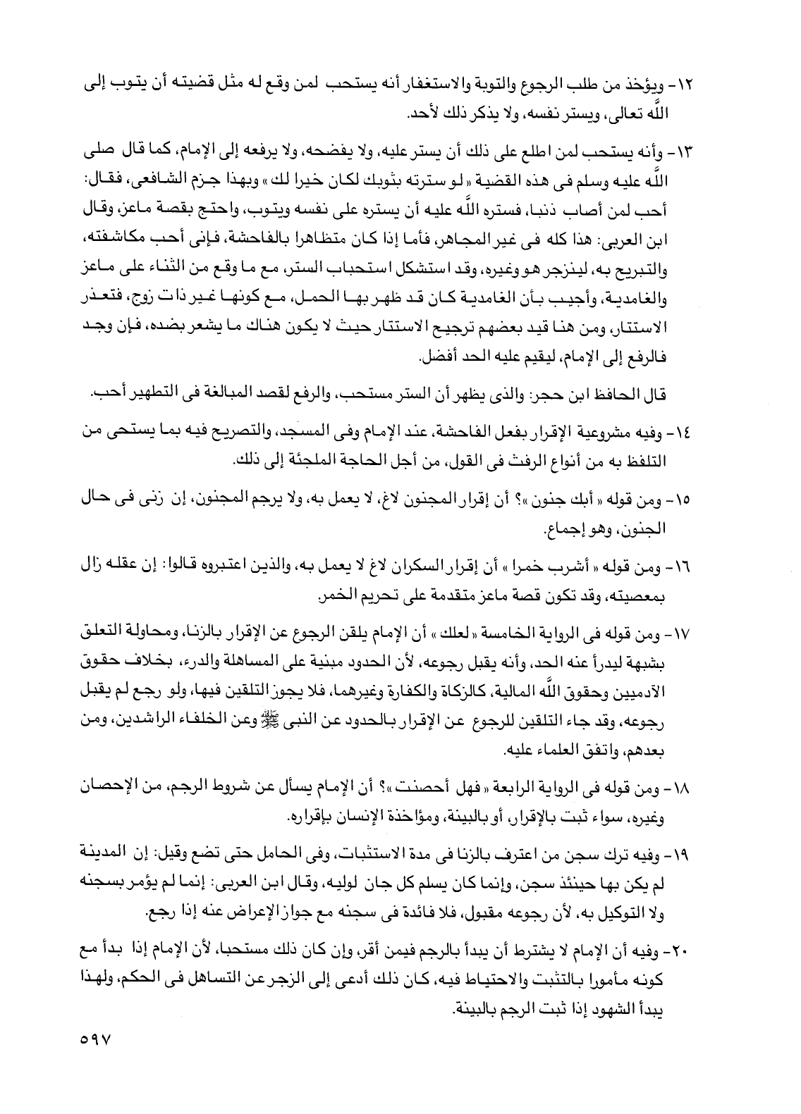 17 - ومن قوله في الرواية الخامسة "لعلك" أن الإمام يلقن الرجوع عن الإقرار بالزنا، ومحاولة التعلق بشبهة ليدرأ عنه الحد، وأنه يقبل رجوعه، لأن الحدود مبنية على المساهلة والدرء، بخلاف حقوق الآدميين وحقوق الله المالية، كالزكاة والكفارة وغيرهما، فلا يجوز التلقين فيها، ولو رجع لم يقبل رجوعه، وقد جاء التلقين للرجوع عن الإقرار بالحدود عن النبي صلى الله عليه وسلم وعن الخلفاء الراشدين، ومن بعدهم، واتفق العلماء عليه.