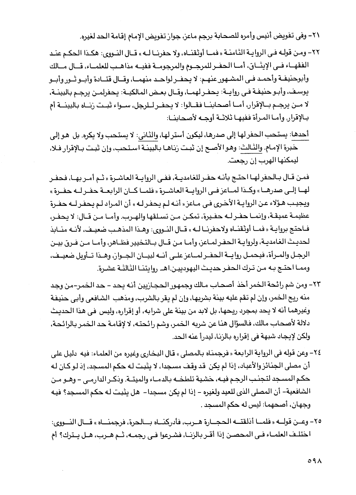 22 - ومن قوله في الرواية الثامنة "فما أوثقناه، ولا حفرنا له" قال النووي: هكذا الحكم عند الفقهاء في الإيثاق، أما الحفر للمرجوم والمرجومة ففيه مذاهب للعلماء، قال مالك وأبو حنيفة وأحمد في المشهور عنهم: لا يحفر لواحد منهما، وقال قتادة وأبو ثور وأبو يوسف، وأبو حنيفة في رواية: يحفر لهما، وقال بعض المالكية: يحفر لمن يرجم بالبينة، لا من يرجم بالإقرار، أما أصحابنا فقالوا: لا يحفر للرجل، سواء ثبت زناه بالبينة أم بالإقرار. وأما المرأة ففيها ثلاثة أوجه لأصحابنا: