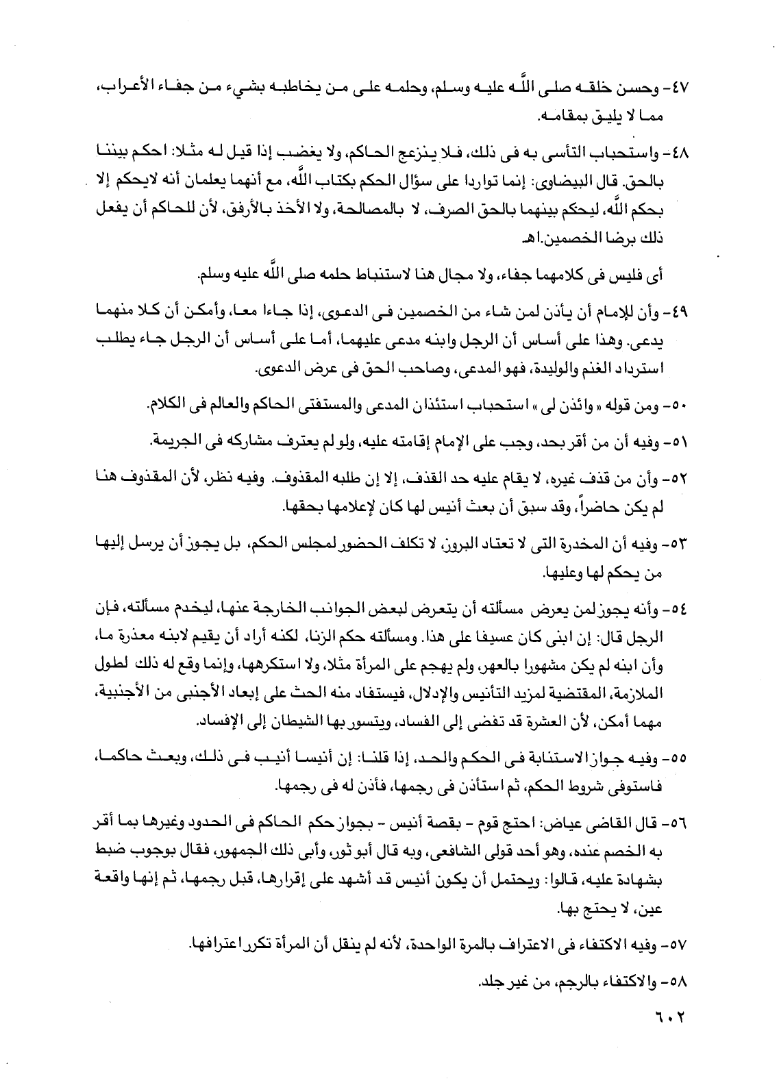 56 - قال القاضي عياض: احتج قوم -بقصة أنيس- بجواز حكم الحاكم في الحدود وغيرها بما أقر به الخصم عنده، وهو أحد قولي الشافعي، وبه قال أبو ثور، وأبي ذلك الجمهور، فقال بوجوب ضبط بشهادة عليه، قالوا: ويحتمل أن يكون أنيس قد أشهد على إقرارها، قبل رجمها، ثم إنها واقعة عين، لا يحتج بها.