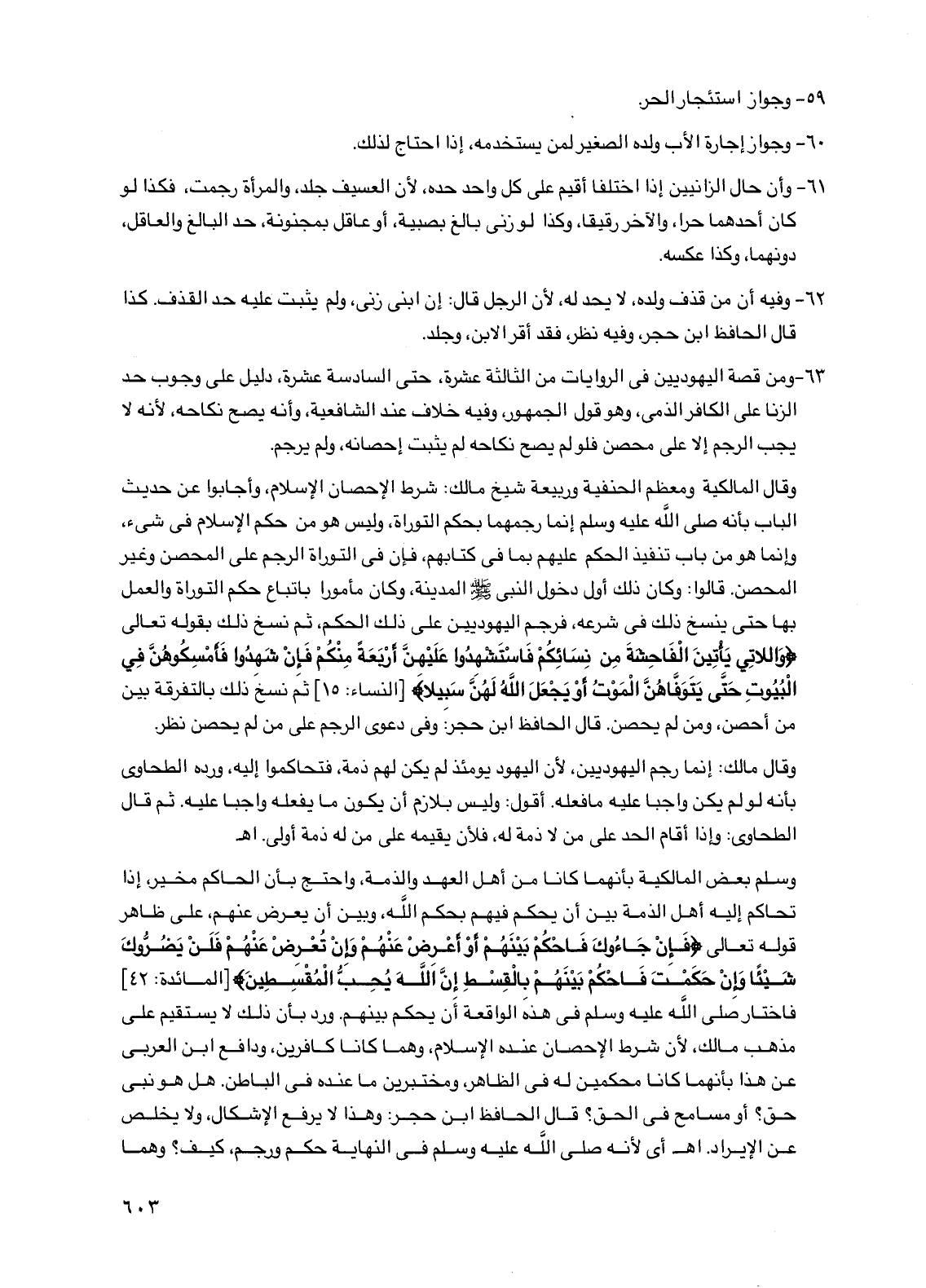 63 - ومن قصة اليهوديين في الروايات من الثالثة عشرة، حتى السادسة عشرة، دليل على وجوب حد الزنا على الكافر الذمي، وهو قول الجمهور، وفيه خلاف عند الشافعية، وأنه يصح نكاحه، لأنه لا يجب الرجم إلا على محصن فلو لم يصح نكاحه لم يثبت إحصانه، ولم يرجم.