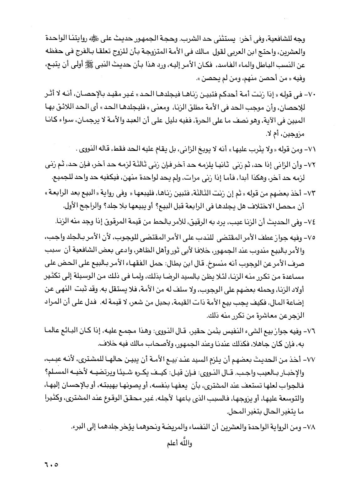 73 - أخذ بعضهم من قوله "ثم إن زنت الثالثة، فتبين زناها، فليبعها" وفي رواية "البيع بعد الرابعة" أن محصل الاختلاف هل يجلدها في الرابعة قبل البيع؟ أو يبيعها بلا جلد؟ والراجح الأول.