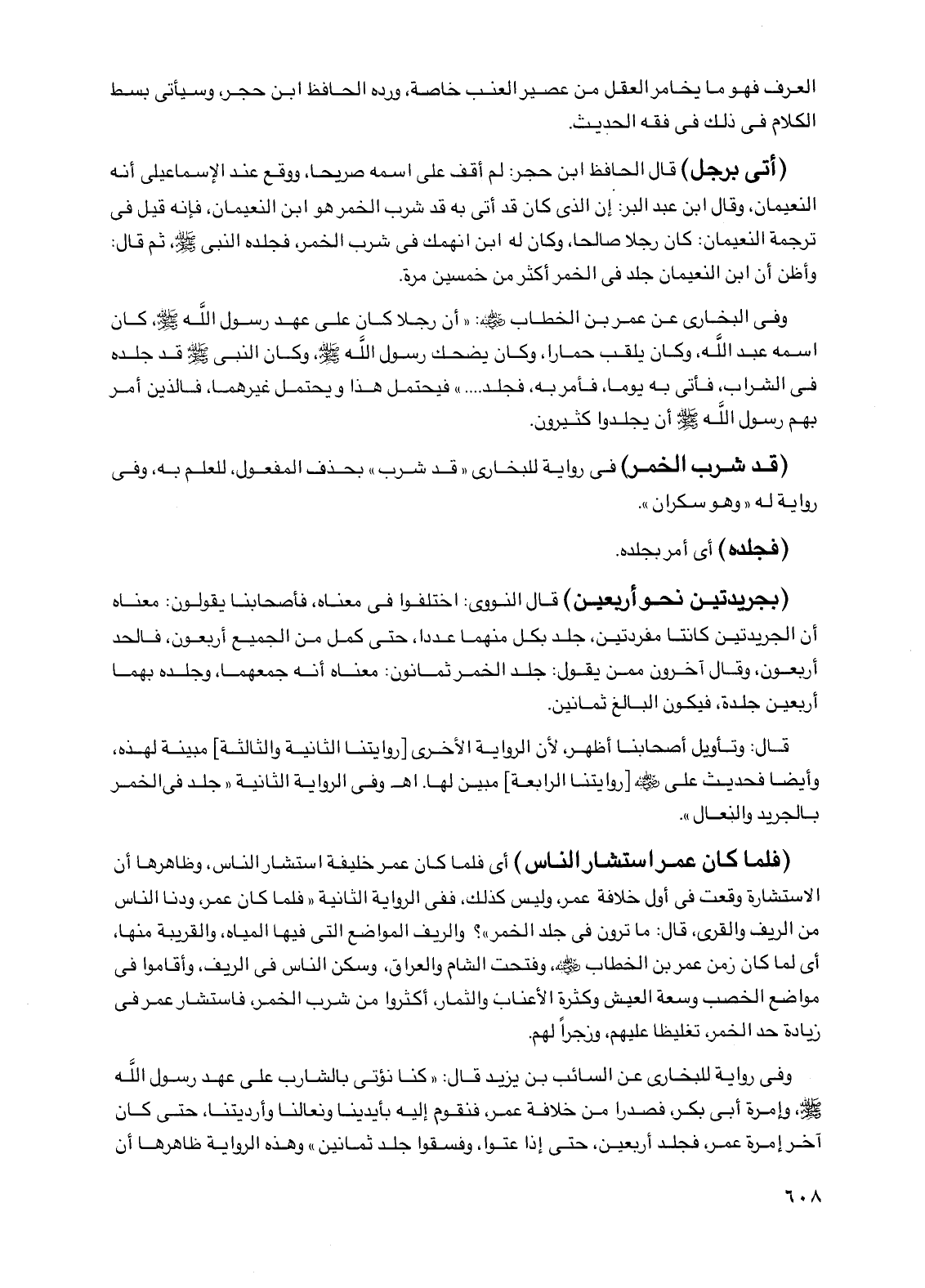 وفي رواية للبخاري عن السائب بن يزيد قال: "كنا نؤتى بالشارب على عهد رسول الله صلى الله عليه وسلم، وإمرة أبي بكر، فصدرا من خلافة عمر، فنقوم إليه بأيدينا ونعالنا وأرديتنا، حتى كان آخر إمرة عمر، فجلد أربعين، حتى إذا عتوا، وفسقوا جلد ثمانين" وهذه الرواية ظاهرها أن