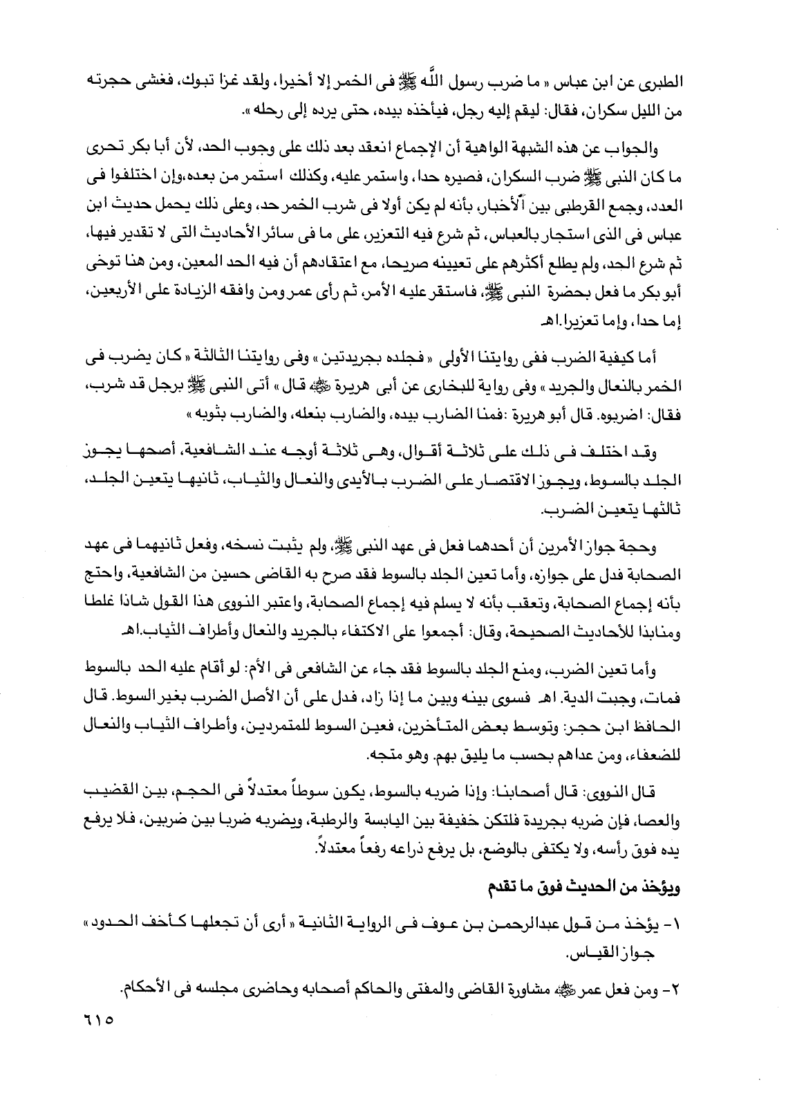 وأما تعين الضرب، ومنع الجلد بالسوط فقد جاء عن الشافعي في الأم: لو أقام عليه الحد بالسوط فمات، وجبت الدية. اهـ فسوى بينه وبين ما إذا زاد، فدل على أن الأصل الضرب بغير السوط. قال الحافظ ابن حجر: وتوسط بعض المتأخرين، فعين السوط للمتمردين، وأطراف الثياب والنعال للضعفاء، ومن عداهم بحسب ما يليق بهم. وهو متجه.