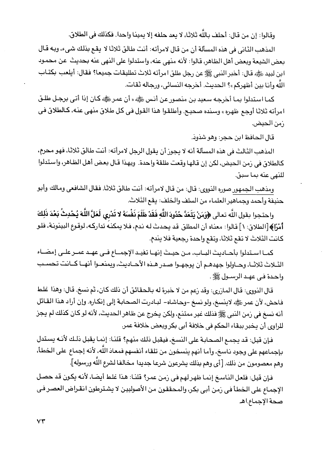 ومذهب الجمهور صوره النووي: قال: من قال لامرأته: أنت طالق ثلاثًا. فقال الشافعي ومالك وأبو حنيفة وأحمد وجماهير العلماء من السلف والخلف: يقع الثلاث.