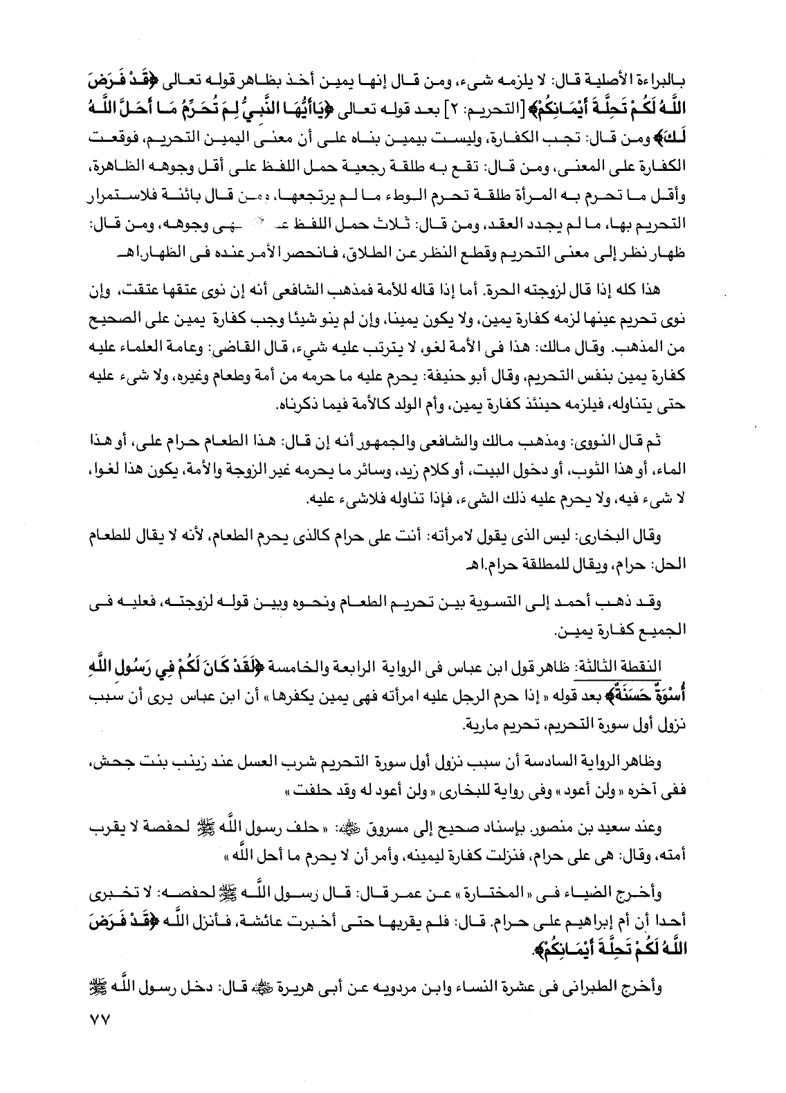 وعند سعيد بن منصور. بإسناد صحيح إلى مسروق رضي الله عنه: "حلف رسول الله صلى الله عليه وسلم لحفصة لا يقرب أمته، وقال: هي علي حرام، فنزلت كفارة ليمينه، وأمر أن لا يحرم ما أحل الله".