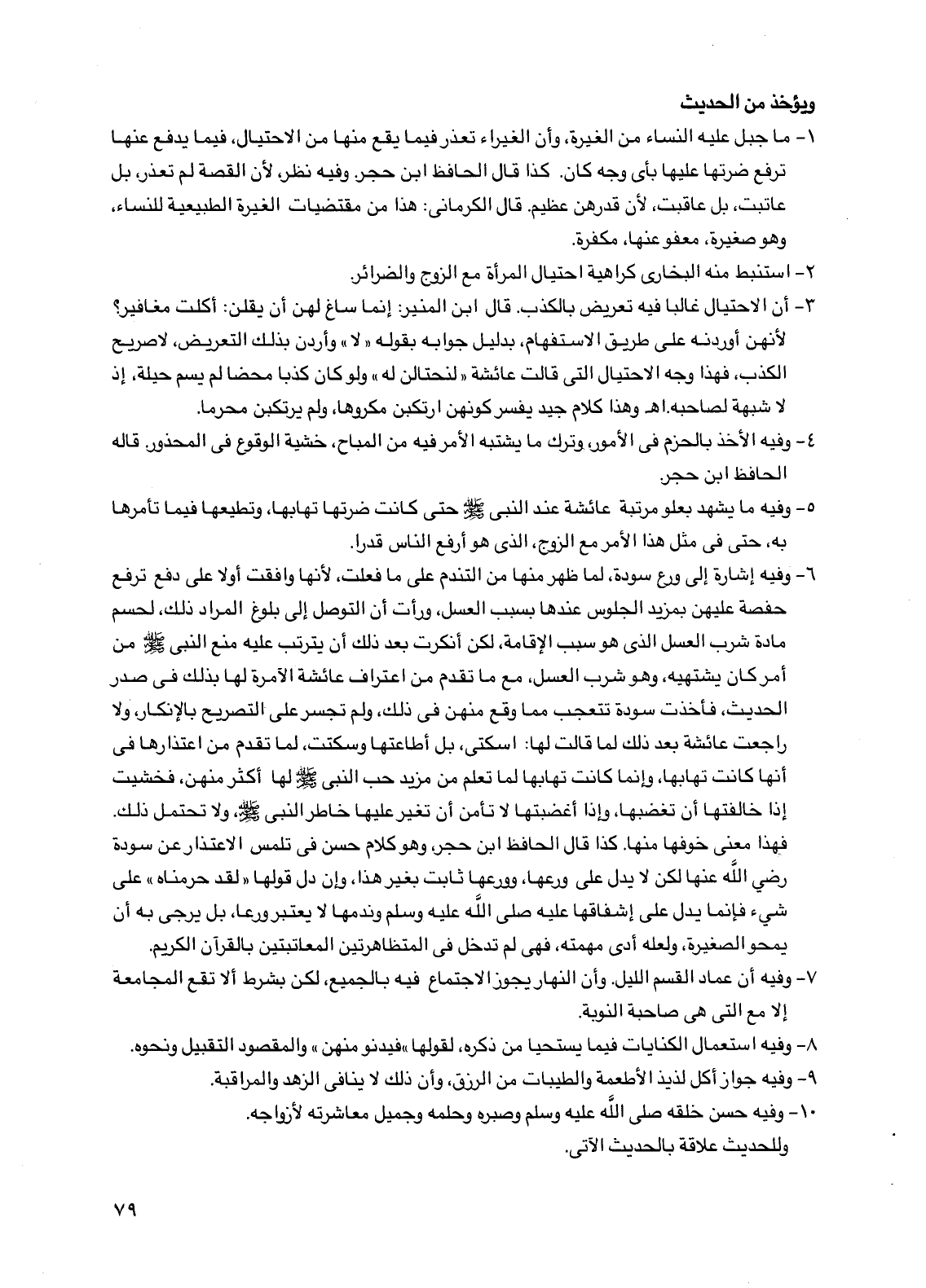 6 - وفيه إشارة إلى ورع سودة، لما ظهر منها من التندم على ما فعلت، لأنها وافقت أولاً على دفع ترفع حفصة عليهن بمزيد الجلوس عندها بسبب العسل، ورأت أن التوصل إلى بلوغ المراد ذلك، لحسم مادة شرب العسل الذي هو سبب الإقامة، لكن أنكرت بعد ذلك أن يترتب عليه منع النبي صلى الله عليه وسلم من أمر كان يشتهيه، وهو شرب العسل، مع ما تقدم من اعتراف عائشة الآمرة لها بذلك في صدر الحديث، فأخذت سودة تتعجب مما وقع منهن في ذلك، ولم تجسر على التصريح بالإنكار، ولا راجعت عائشة بعد ذلك لما قالت لها: اسكتي، بل أطاعتها وسكتت، لما تقدم من اعتذارها في أنها كانت تهابها، وإنما كانت تهابها لما تعلم من مزيد حب النبي صلى الله عليه وسلم لها أكثر منهن، فخشيت إذا خالفتها أن تغضبها، وإذا أغضبتها لا تأمن أن تغير عليها خاطر النبي صلى الله عليه وسلم، ولا تحتمل ذلك. فهذا معنى خوفها منها. كذا قال الحافظ ابن حجر، وهو كلام حسن في تلمس الاعتذار عن سودة رضي الله عنها لكن لا يدل على ورعها، وورعها ثابت بغير هذا، وإن دل قولها "لقد حرمناه" على شيء فإنما يدل على إشفاقها عليه صلى الله عليه وسلم وندمها لا يعتبر ورعًا، بل يرجى به أن يمحو الصغيرة، ولعله أدى مهمته، فهي لم تدخل في المتظاهرتين المعاتبتين بالقرآن الكريم.