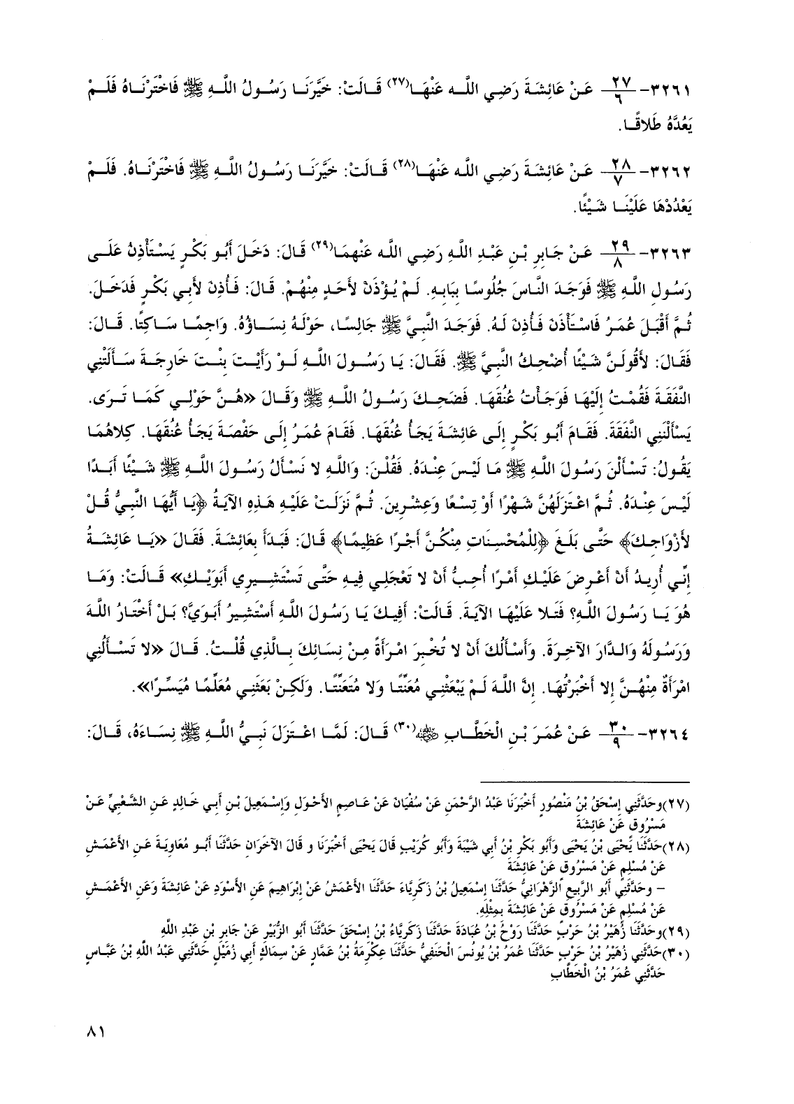3263 - عن جابر بن عبد الله رضي الله عنهما قال: دخل أبو بكر يستأذن على رسول الله صلى الله عليه وسلم فوجد الناس جلوسًا ببابه. لم يؤذن لأحد منهم. قال: فأذن لأبي بكر فدخل. ثم أقبل عمر فاستأذن فأذن له. فوجد النبي صلى الله عليه وسلم جالسًا، حوله نساؤه. واجمًا ساكتًا. قال: فقال: لأقولن شيئًا أضحك النبي صلى الله عليه وسلم. فقال: يا رسول الله لو رأيت بنت خارجة سألتني النفقة فقمت إليها فوجأت عنقها. فضحك رسول الله صلى الله عليه وسلم وقال "هن حولي كما ترى. يسألنني النفقة. فقام أبو بكر إلى عائشة يجأ عنقها. فقام عمر إلى حفصة يجأ عنقها. كلاهما يقول: تسألن رسول الله صلى الله عليه وسلم ما ليس عنده. فقلن: والله لا نسأل رسول الله صلى الله عليه وسلم شيئًا أبدًا ليس عنده. ثم اعتزلهن شهرًا أو تسعًا وعشرين. ثم نزلت عليه هذه الآية {يا أيها النبي قل لأزواجك} حتى بلغ {للمحسنات منكن أجرًا عظيمًا} قال: فبدأ بعائشة. فقال "يا عائشة إني أريد أن أعرض عليك أمرًا أحب أن لا تعجلي فيه حتى تستشيري أبويك" قالت: وما هو يا رسول الله؟ فتلا عليها الآية. قالت: أفيك يا رسول الله أستشير أبوي؟ بل أختار الله ورسوله والدار الآخرة. وأسألك أن لا تخبر امرأة من نسائك بالذي قلت. قال "لا تسألني امرأة منهن إلا أخبرتها. إن الله لم يبعثني معنتًا ولا متعنتًا. ولكن بعثني معلمًا ميسرًا".