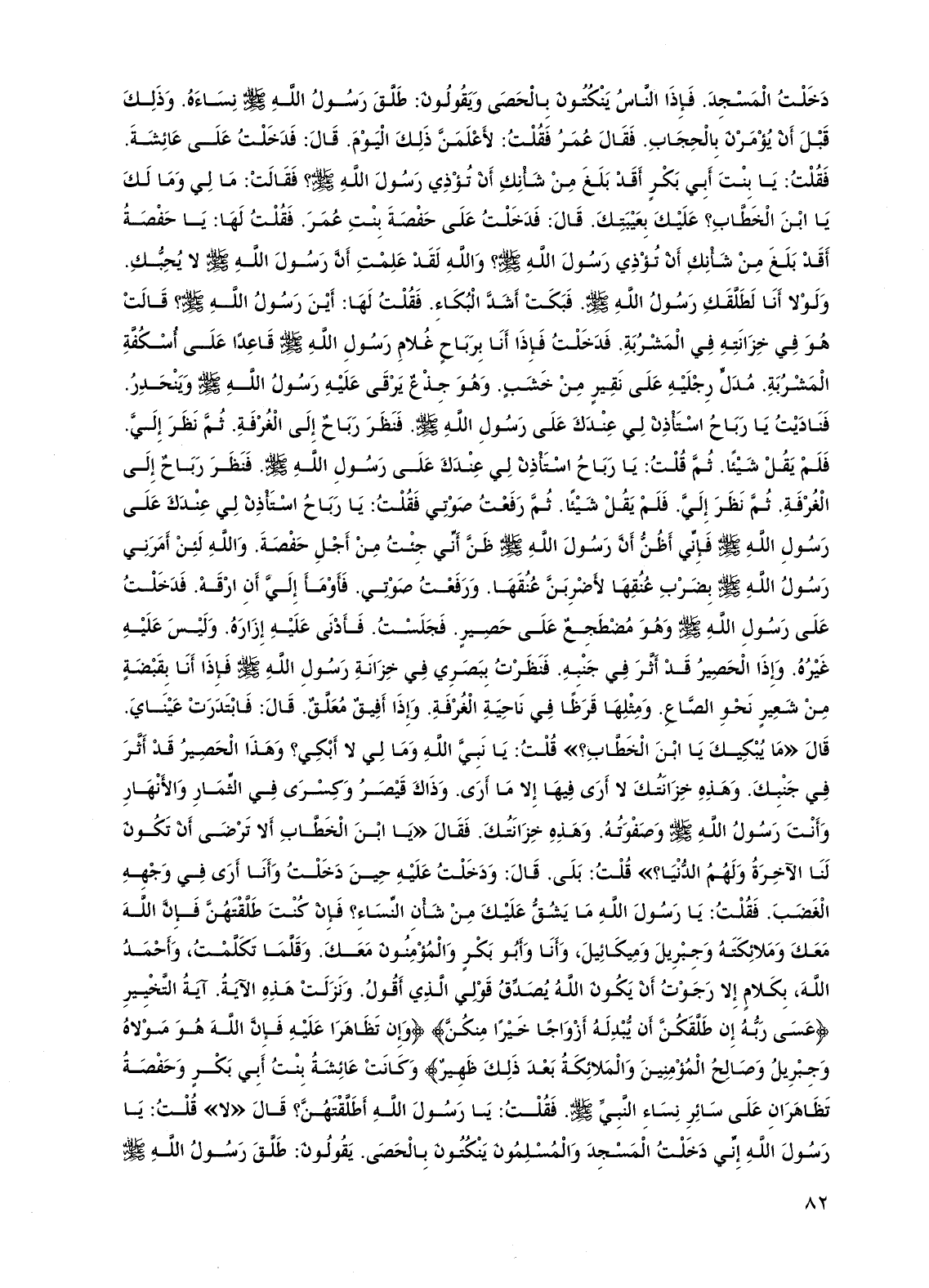 دخلت المسجد. فإذا الناس ينكتون بالحصى ويقولون: طلق رسول الله صلى الله عليه وسلم نساءه. وذلك قبل أن يؤمرن بالحجاب. فقال عمر فقلت: لأعلمن ذلك اليوم. قال: فدخلت على عائشة. فقلت: يا بنت أبي بكر أقد بلغ من شأنك أن تؤذي رسول الله صلى الله عليه وسلم؟ فقالت: ما لي وما لك يا ابن الخطاب؟ عليك بعيبتك. قال: فدخلت على حفصة بنت عمر. فقلت لها: يا حفصة أقد بلغ من شأنك أن تؤذي رسول الله صلى الله عليه وسلم؟ والله لقد علمت أن رسول الله صلى الله عليه وسلم لا يحبك. ولولا أنا لطلقك رسول الله صلى الله عليه وسلم. فبكت أشد البكاء. فقلت لها: أين رسول الله صلى الله عليه وسلم؟ قالت هو في خزانته في المشربة. فدخلت فإذا أنا برباح غلام رسول الله صلى الله عليه وسلم قاعدًا على أسكفة المشربة. مدل رجليه على نقير من خشب. وهو جذع يرقى عليه رسول الله صلى الله عليه وسلم وينحدر. فناديت يا رباح استأذن لي عندك على رسول الله صلى الله عليه وسلم. فنظر رباح إلى الغرفة. ثم نظر إلي. فلم يقل شيئًا. ثم قلت: يا رباح استأذن لي عندك على رسول الله صلى الله عليه وسلم. فنظر رباح إلى الغرفة. ثم نظر إلي. فلم يقل شيئًا. ثم رفعت صوتي فقلت: يا رباح استأذن لي عندك على رسول الله صلى الله عليه وسلم فإني أظن أن رسول الله صلى الله عليه وسلم ظن أني جئت من أجل حفصة. والله لئن أمرني رسول الله صلى الله عليه وسلم بضرب عنقها لأضربن عنقها. ورفعت صوتي. فأومأ إلي أن ارقه. فدخلت على رسول الله صلى الله عليه وسلم وهو مضطجع على حصير. فجلست. فأدنى عليه إزاره. وليس عليه غيره. وإذا الحصير قد أثر في جنبه. فنظرت ببصري في خزانة رسول الله صلى الله عليه وسلم فإذا أنا بقبضة من شعير نحو الصاع. ومثلها قرظًا في ناحية الغرفة. وإذا أفيق معلق. قال: فابتدرت عيناي.