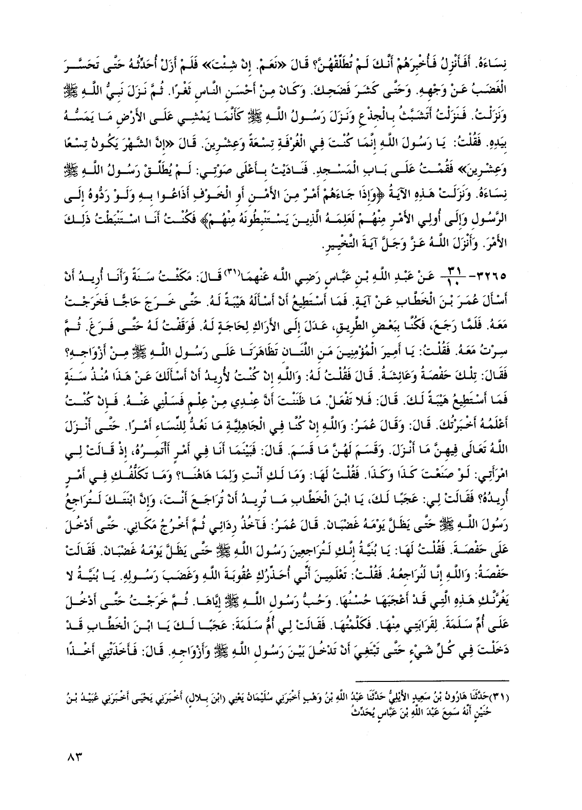 3265 - عن عبد الله بن عباس رضي الله عنهما قال: مكثت سنة وأنا أريد أن أسأل عمر بن الخطاب عن آية. فما أستطيع أن أسأله هيبة له. حتى خرج حاجًا فخرجت معه. فلما رجع، فكنا ببعض الطريق، عدل إلى الأراك لحاجة له. فوقفت له حتى فرغ. ثم سرت معه. فقلت: يا أمير المؤمنين من اللتان تظاهرتا على رسول الله صلى الله عليه وسلم من أزواجه؟ فقال: تلك حفصة وعائشة. قال فقلت له: والله إن كنت لأريد أن أسألك عن هذا منذ سنة فما أستطيع هيبة لك. قال: فلا تفعل. ما ظننت أن عندي من علم فسلني عنه. فإن كنت أعلمه أخبرتك. قال: وقال عمر: والله إن كنا في الجاهلية ما نعد للنساء أمرًا. حتى أنزل الله تعالى فيهن ما أنزل. وقسم لهن ما قسم. قال: فبينما أنا في أمر أأتمره، إذ قالت لي امرأتي: لو صنعت كذا وكذا. فقلت لها: وما لك أنت ولما ها هنا؟ وما تكلفك في أمر أريده؟ فقالت لي: عجبًا لك، يا ابن الخطاب ما تريد أن تراجع أنت، وإن ابنتك لتراجع رسول الله صلى الله عليه وسلم حتى يظل يومه غضبان. قال عمر: فآخذ ردائي ثم أخرج مكاني. حتى أدخل على حفصة. فقلت لها: يا بنية إنك لتراجعين رسول الله صلى الله عليه وسلم حتى يظل يومه غضبان. فقالت حفصة: والله إنا لنراجعه. فقلت: تعلمين أني أحذرك عقوبة الله وغضب رسوله. يا بنية لا يغرنك هذه التي قد أعجبها حسنها. وحب رسول الله صلى الله عليه وسلم إياها. ثم خرجت حتى أدخل على أم سلمة. لقرابتي منها. فكلمتها. فقالت لي أم سلمة: عجبًا لك يا ابن الخطاب قد دخلت في كل شيء حتى تبتغي أن تدخل بين رسول الله صلى الله عليه وسلم وأزواجه. قال: فأخذتني أخذًا