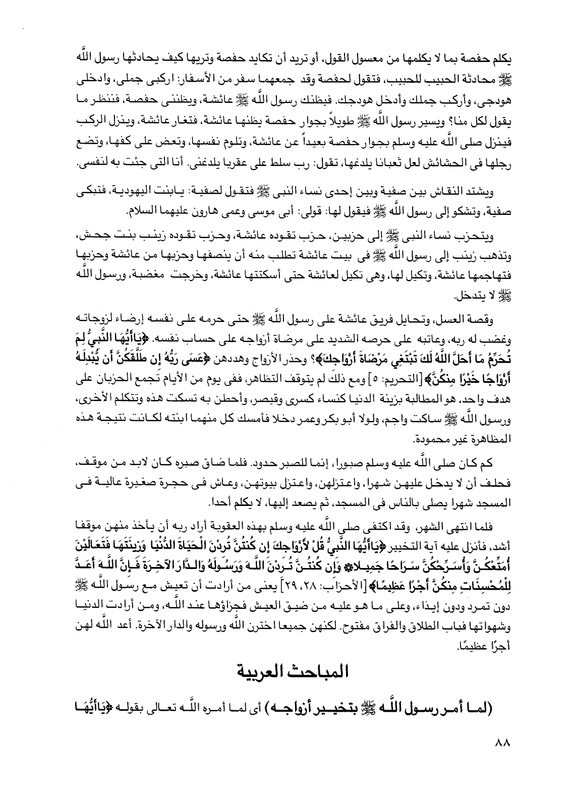 وقصة العسل، وتحايل فريق عائشة على رسول الله صلى الله عليه وسلم حتى حرمه على نفسه إرضاء لزوجاته وغضب له ربه، وعاتبه على حرصه الشديد على مرضاة أزواجه على حساب نفسه. {يا أيها النبي لم تحرم ما أحل الله لك تبتغي مرضاة أزواجك} وحذر الأزواج وهددهن {عسى ربه إن طلقكن أن يبدله أزواجًا خيرًا منكن} [التحريم: 5] ومع ذلك لم يتوقف التظاهر، ففي يوم من الأيام تجمع الحزبان على هدف واحد، هو المطالبة بزينة الدنيا كنساء كسرى وقيصر، وأحطن به تسكت هذه وتتكلم الأخرى، ورسول الله صلى الله عليه وسلم ساكت واجم، ولولا أبو بكر وعمر دخلا فأمسك كل منهما ابنته لكانت نتيجة هذه المظاهرة غير محمودة.