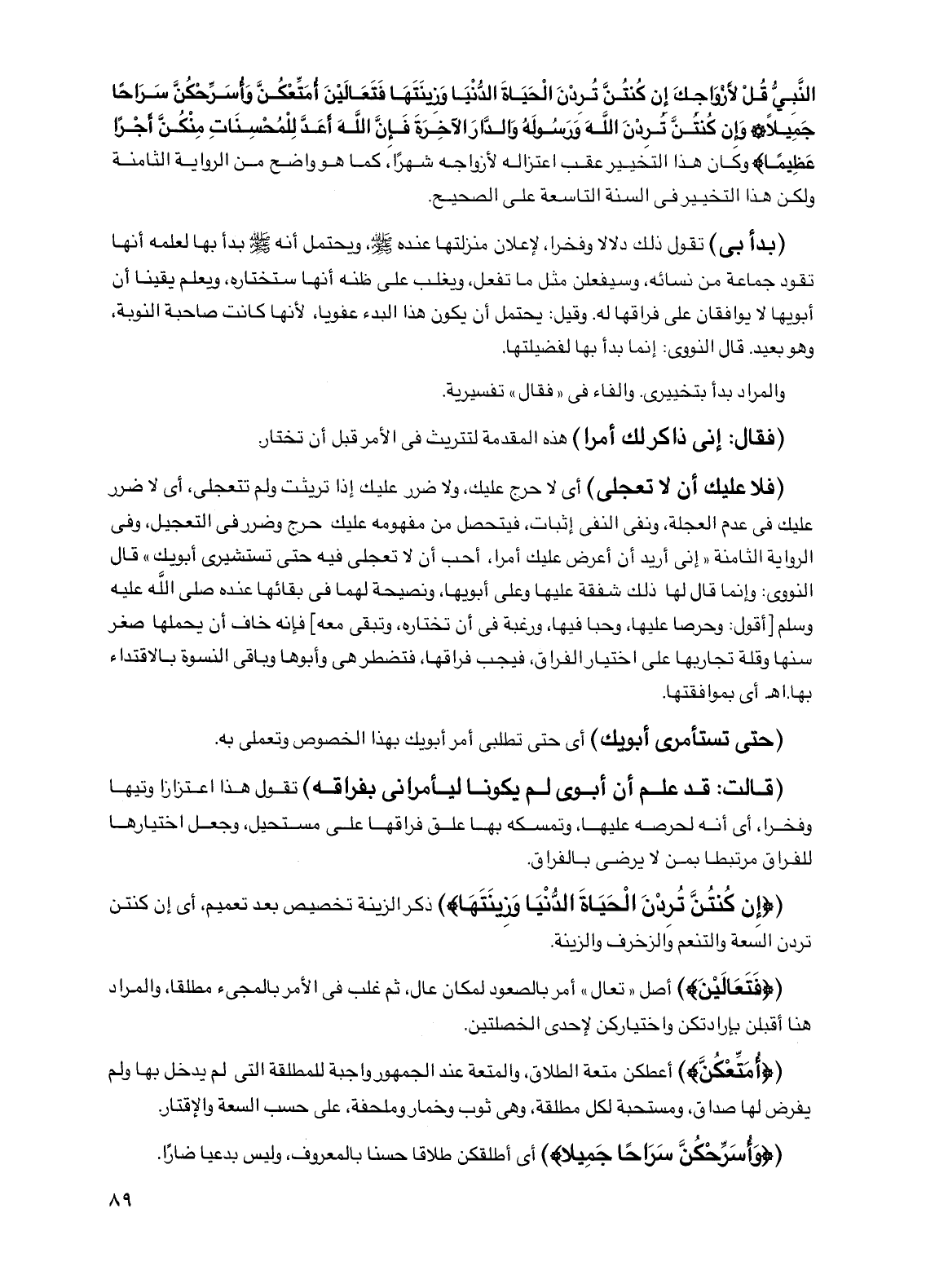النبي قل لأزواجك إن كنتن تردن الحياة الدنيا وزينتها فتعالين أمتعكن وأسرحكن سراحًا جميلاً * وإن كنتن تردن الله ورسوله والدار الآخرة فإن الله أعد للمحسنات منكن أجرًا عظيمًا} وكان هذا التخيير عقب اعتزاله لأزواجه شهرًا، كما هو واضح من الرواية الثامنة ولكن هذا التخيير في السنة التاسعة على الصحيح.