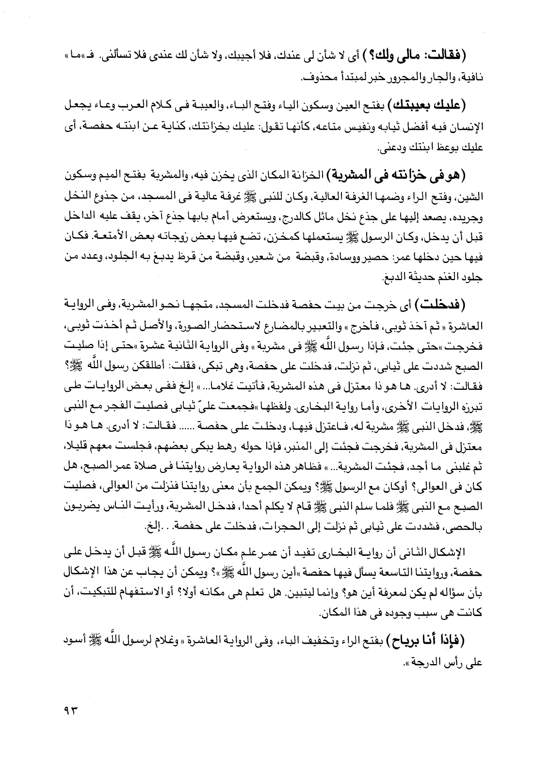 (فدخلت) أي خرجت من بيت حفصة فدخلت المسجد، متجهًا نحو المشربة، وفي الرواية العاشرة "ثم آخذ ثوبي، فأخرج" والتعبير بالمضارع لاستحضار الصورة، والأصل ثم أخذت ثوبي، فخرجت" حتى جئت، فإذا رسول الله صلى الله عليه وسلم في مشربة" وفي الرواية الثانية عشرة" حتى إذا صليت الصبح شددت علي ثيابي، ثم نزلت، فدخلت على حفصة، وهي تبكي، فقلت: أطلقكن رسول الله صلى الله عليه وسلم؟ فقالت: لا أدري. ها هو ذا معتزل في هذه المشربة، فأتيت غلامًا ... " إلخ ففي بعض الروايات طي تبرزه الروايات الأخرى، وأما رواية البخاري. ولفظها" فجمعت علي ثيابي فصليت الفجر مع النبي صلى الله عليه وسلم، فدخل النبي صلى الله عليه وسلم مشربة له، فاعتزل فيها، ودخلت على حفصة ...... فقالت: لا أدري. ها هو ذا معتزل في المشربة، فخرجت فجئت إلى المنبر، فإذا حوله رهط يبكي بعضهم، فجلست معهم قليلاً، ثم غلبني ما أجد، فجئت المشربة ... " فظاهر هذه الرواية يعارض روايتنا في صلاة عمر الصبح، هل كان في العوالي؟ أو كان مع الرسول صلى الله عليه وسلم؟ ويمكن الجمع بأن معنى روايتنا فنزلت من العوالي، فصليت الصبح مع النبي صلى الله عليه وسلم فلما سلم النبي صلى الله عليه وسلم قام لا يكلم أحدًا، فدخل المشربة، ورأيت الناس يضربون بالحصى، فشددت علي ثيابي ثم نزلت إلى الحجرات، فدخلت على حفصة ... إلخ.