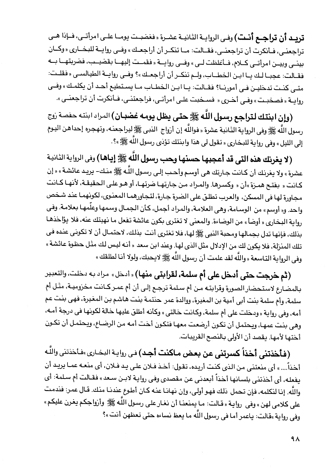 تريد أن تراجع أنت) وفي الرواية الثانية عشرة "فغضبت يومًا على امرأتي، فإذا هي تراجعني، فأنكرت أن تراجعني، فقالت: ما تنكر أن أراجعك" وفي رواية للبخاري "وكان بيني وبين امرأتي كلام، فأغلظت لي" وفي رواية "فقمت إليها بقضيب، فضربتها به فقالت: عجبًا لك يا ابن الخطاب، ولم تنكر أن أراجعك"؟ وفي رواية الطيالسي "فقلت: متى كنت تدخلين في أمورنا؟ فقالت: يا ابن الخطاب ما يستطيع أحد أن يكلمك" وفي رواية "فصخبت" وفي أخرى "فسخبت على امرأتي، فراجعتني، فأنكرت أن تراجعني".