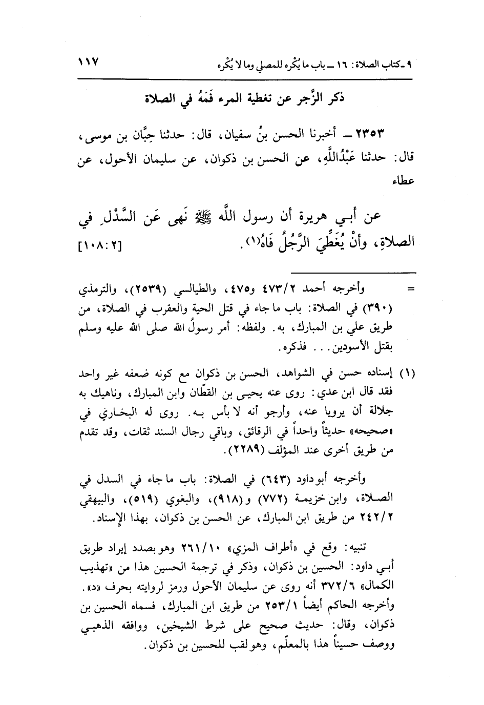 2353 - أَخْبَرَنَا الْحَسَنُ بْنُ سُفْيَانَ، قَالَ: حَدَّثَنَا حِبَّانُ بْنُ مُوسَى، قَالَ: حَدَّثَنَا عَبْدُ اللَّهِ، عَنِ الْحَسَنِ بْنِ ذَكْوَانَ، عَنْ سُلَيْمَانَ الْأَحْوَلِ، عَنْ عَطَاءٍ، عَنْ أَبِي هُرَيْرَةَ، «أَنَّ رَسُولَ اللَّهِ صَلَّى اللَّهُ عَلَيْهِ وَسَلَّمَ نَهَى عَنِ السَّدْلِ فِي الصَّلَاةِ، وَأَنْ يُغَطِّيَ الرَّجُلُ فَاهُ» (¬1) . [2: 108]