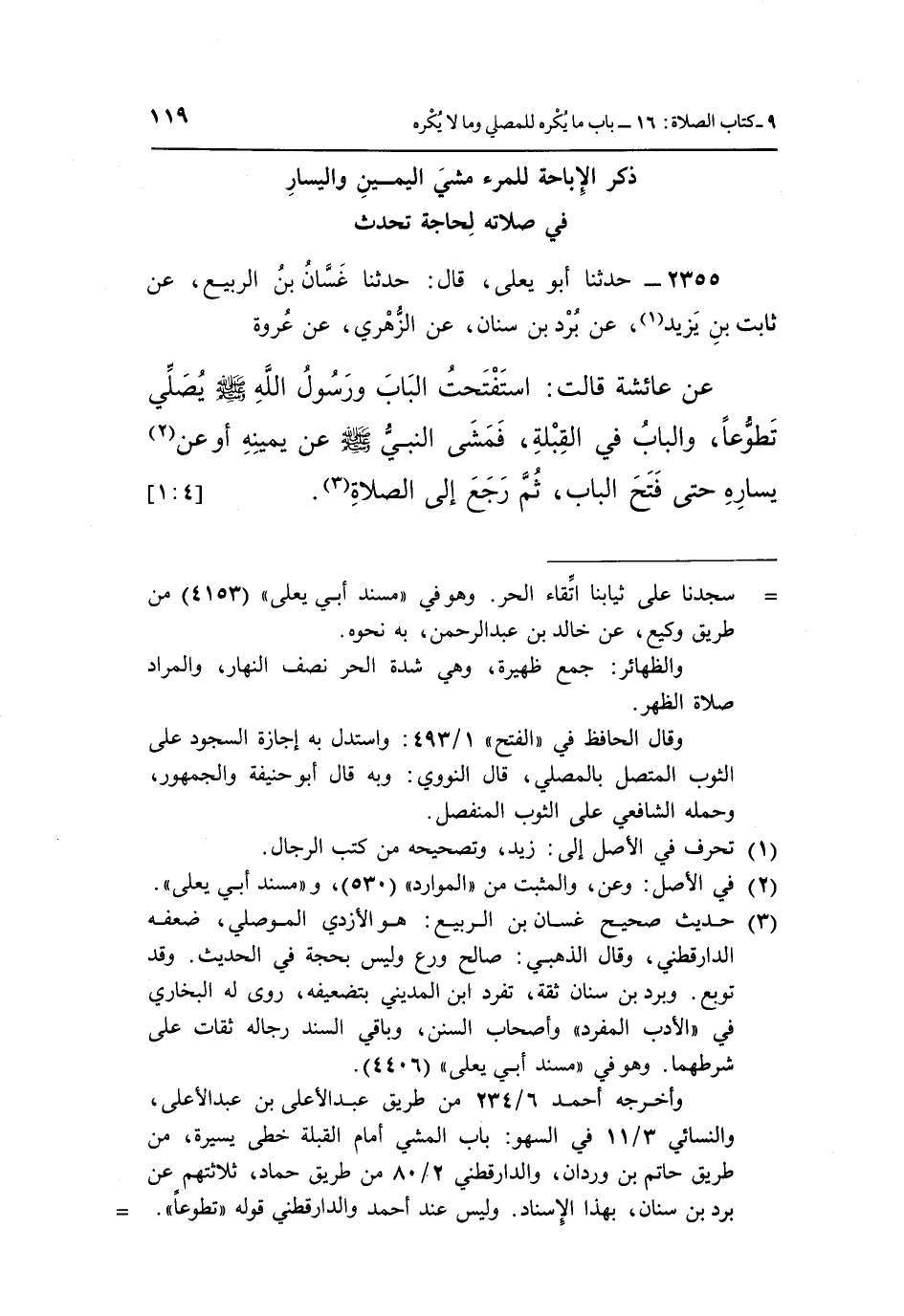 2355 - حَدَّثَنَا أَبُو يَعْلَى، قَالَ: حَدَّثَنَا غَسَّانُ بْنُ الرَّبِيعِ، عَنْ ثَابِتِ بْنِ يَزِيدَ (¬1) ، عَنْ بُرْدِ بْنِ سِنَانَ، عَنِ الزُّهْرِيِّ، عَنْ عُرْوَةَ، عَنْ عَائِشَةَ، قَالَتْ: «اسْتَفْتَحْتُ الْبَابَ وَرَسُولُ اللَّهِ صَلَّى اللَّهُ عَلَيْهِ وَسَلَّمَ يُصَلِّي تَطَوُّعًا، وَالْبَابُ فِي الْقِبْلَةِ، فَمَشَى النَّبِيُّ صَلَّى اللَّهُ عَلَيْهِ وَسَلَّمَ عَنْ يَمِينِهِ أَوْ عَنْ (¬2) يَسَارِهِ حَتَّى فَتَحَ الْبَابَ، ثُمَّ رَجَعَ إِلَى الصَّلَاةِ» (¬3) . [4: 1]