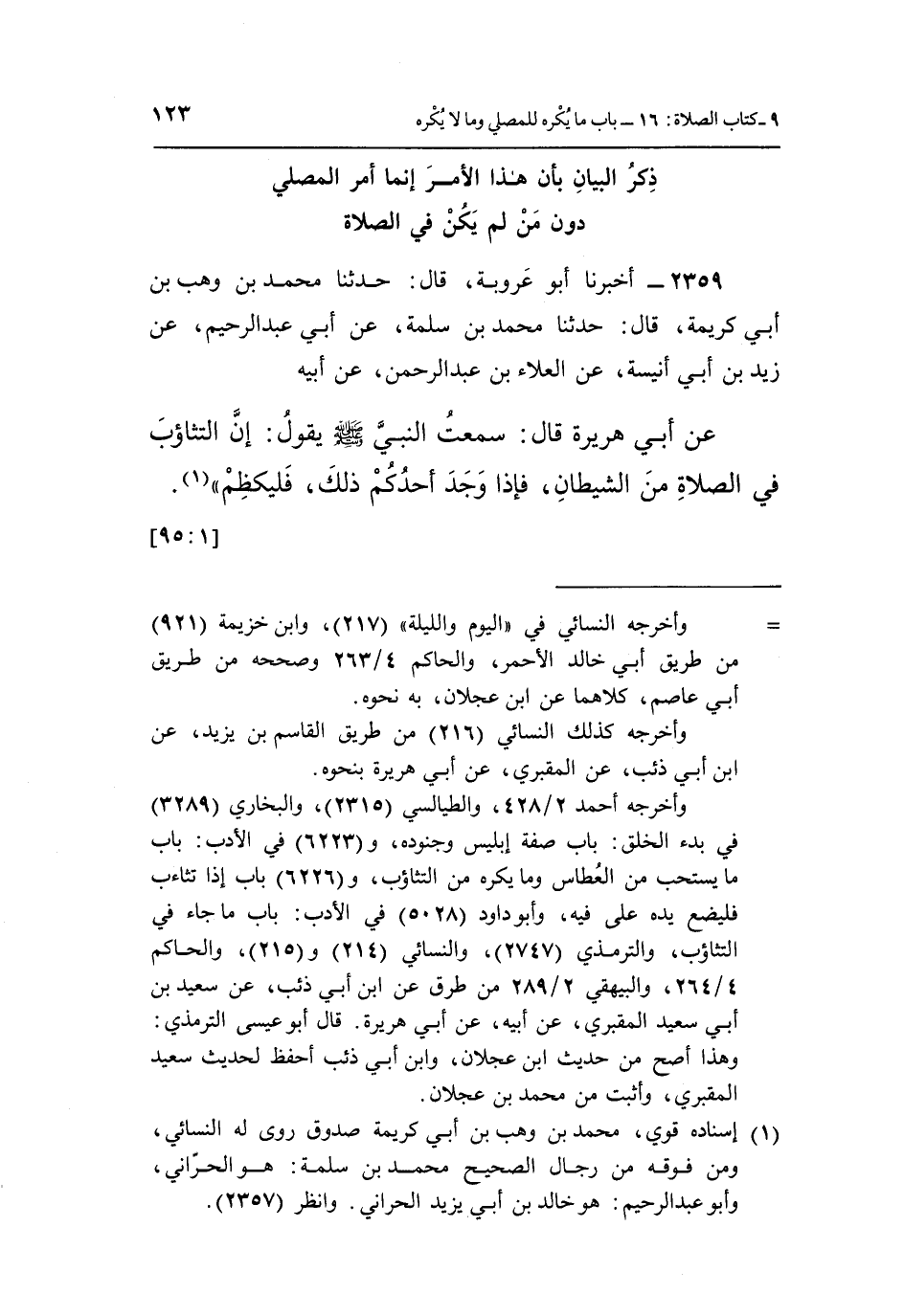 2359 - أَخْبَرَنَا أَبُو عَرُوبَةَ، قَالَ: حَدَّثَنَا مُحَمَّدُ بْنُ وَهْبِ بْنِ أَبِي كَرِيمَةَ، قَالَ: حَدَّثَنَا مُحَمَّدُ بْنُ سَلَمَةَ، عَنْ أَبِي عَبْدِ الرَّحِيمِ، عَنْ زَيْدِ بْنِ أَبِي أُنَيْسَةَ، عَنِ الْعَلَاءِ بْنِ عَبْدِ الرَّحْمَنِ، عَنْ أَبِيهِ، عَنْ أَبِي هُرَيْرَةَ، قَالَ: سَمِعْتُ النَّبِيَّ صَلَّى اللَّهُ عَلَيْهِ وَسَلَّمَ يَقُولُ: «إِنَّ التَّثَاؤُبَ فِي الصَّلَاةِ مِنَ الشَّيْطَانِ، فَإِذَا وَجَدَ أَحَدُكُمْ ذَلِكَ فَلْيَكْظِمْ» (¬1) . [1: 95]
