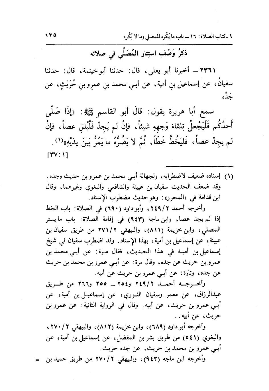2361 - أَخْبَرَنَا أَبُو يَعْلَى، قَالَ: حَدَّثَنَا أَبُو خَيْثَمَةَ، قَالَ: حَدَّثَنَا سُفْيَانُ، عَنْ إِسْمَاعِيلَ بْنِ أُمَيَّةَ، عَنْ أَبِي مُحَمَّدِ بْنِ عَمْرِو بْنِ حُرَيْثٍ، عَنْ جَدِّهِ، سَمِعَ أَبَا هُرَيْرَةَ يَقُولُ: قَالَ أَبُو الْقَاسِمِ صَلَّى اللَّهُ عَلَيْهِ وَسَلَّمَ: «إِذَا صَلَّى أَحَدُكُمْ فَلْيَجْعَلْ تِلْقَاءَ وَجْهِهِ شَيْئًا، فَإِنْ لَمْ يَجِدْ فَلْيُلْقِ عَصًا، فَإِنْ لَمْ يَجِدْ عَصًا فَلْيَخُطَّ خَطًّا، ثُمَّ لَا يَضُرُّهُ مَا يَمُرُّ بَيْنَ يَدَيْهِ» (¬1) . [1: 37]