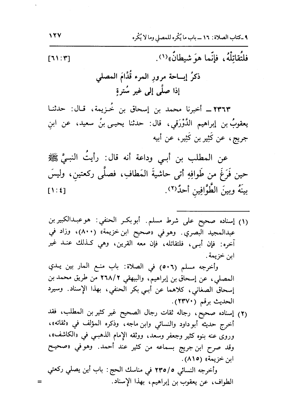 2363 - أَخْبَرَنَا مُحَمَّدُ بْنُ إِسْحَاقَ بْنِ خُزَيْمَةَ، قَالَ: حَدَّثَنَا يَعْقُوبُ بْنُ إِبْرَاهِيمَ الدَّوْرَقِيُّ، قَالَ: حَدَّثَنَا يَحْيَى بْنُ سَعِيدٍ، عَنِ ابْنِ جُرَيْجٍ، عَنْ كَثِيرِ بْنِ كَثِيرٍ، عَنْ أَبِيهِ، عَنِ الْمُطَّلِبِ بْنِ أَبِي وَدَاعَةَ، أَنَّهُ قَالَ: «رَأَيْتُ النَّبِيَّ صَلَّى اللَّهُ عَلَيْهِ وَسَلَّمَ حِينَ فَرَغَ مِنْ طَوَافِهِ أَتَى حَاشِيَةَ الْمَطَافِ، فَصَلَّى رَكْعَتَيْنِ، وَلَيْسَ بَيْنَهُ وَبَيْنَ الطَّوَّافِينَ أَحَدٌ» (¬2) . [4: 1]
