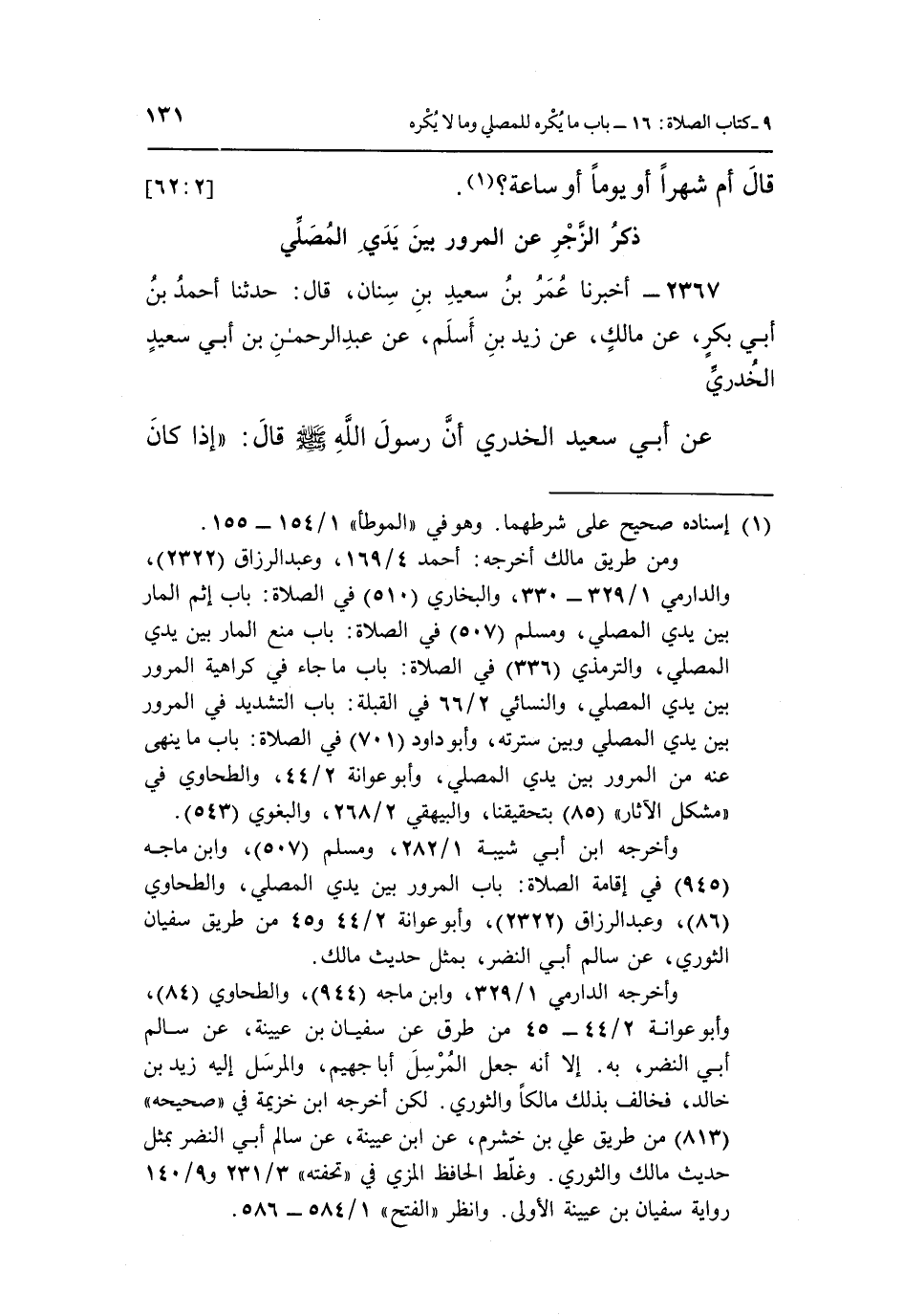 ومن طريق مالك أخرجه: أحمد 4/169، وعبد الرزاق (2322) ، والدارمي 1/329-330، والبخاري (510) في الصلاة: باب إثم المار بين يدي المصلي، ومسلم (507) في الصلاة: باب منع المار بين يدي المصلي، والترمذي (336) في الصلاة: باب ما جاء في كراهية المرور بين يدي المصلي، والنسائي 2/66 في القبلة: باب التشديد في المرور بين يدي المصلي وبين سترته، وأبو داود (701) في الصلاة: باب ما ينهى عنه من المرور بين يدي المصلي، وأبو عوانة 2/44، والطحاوي في "مشكل الآثار" (85) بتحقيقنا، والبيهقي 2/268، والبغوي (543) .