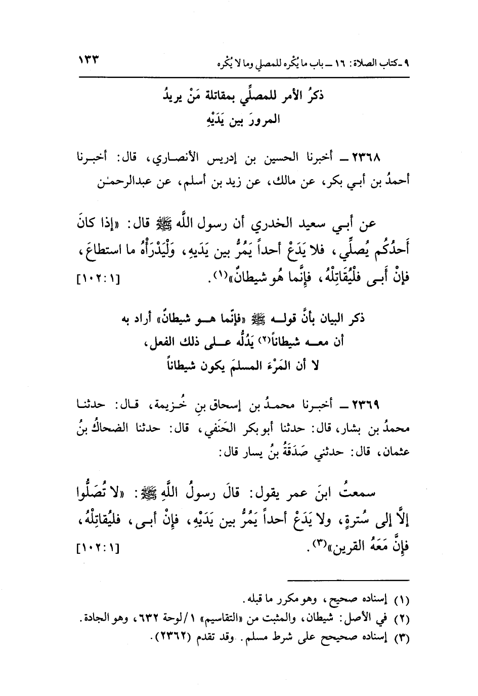 2369 - أَخْبَرَنَا مُحَمَّدُ بْنُ إِسْحَاقَ بْنِ خُزَيْمَةَ، قَالَ: حَدَّثَنَا مُحَمَّدُ بْنُ بَشَّارٍ، قَالَ: حَدَّثَنَا أَبُو بَكْرٍ الْحَنَفِيُّ، قَالَ: حَدَّثَنَا الضَّحَّاكُ بْنُ عُثْمَانَ، قَالَ: حَدَّثَنِي صَدَقَةُ بْنُ يَسَارٍ، قَالَ: سَمِعْتُ ابْنَ عُمَرَ يَقُولُ: قَالَ رَسُولُ اللَّهِ صَلَّى اللَّهُ عَلَيْهِ وَسَلَّمَ: «لَا تُصَلُّوا إِلَّا إِلَى سُتْرَةٍ، وَلَا يَدَعْ أَحَدًا يَمُرُّ بَيْنَ يَدَيْهِ، فَإِنْ أَبَى فَلْيُقَاتِلْهُ، فَإِنَّ مَعَهُ الْقَرِينَ» (¬3) . [1: 102]