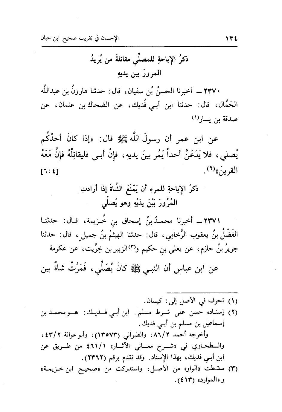 2370 - أَخْبَرَنَا الْحَسَنُ بْنُ سُفْيَانَ، قَالَ: حَدَّثَنَا هَارُونُ بْنُ عَبْدِ اللَّهِ الْحَمَّالُ، قَالَ: حَدَّثَنَا ابْنُ أَبِي فُدَيْكٍ، عَنِ الضَّحَّاكِ بْنِ عُثْمَانَ، عَنْ صَدَقَةَ بْنِ يَسَارٍ (¬1) ، عَنِ ابْنِ عُمَرَ، أَنَّ رَسُولَ اللَّهِ صَلَّى اللَّهُ عَلَيْهِ وَسَلَّمَ قَالَ: «إِذَا كَانَ أَحَدُكُمْ يُصَلِّي، فَلَا يَدَعَنَّ أَحَدًا يَمُرُّ بَيْنَ يَدَيْهِ، فَإِنْ أَبَى فَلْيُقَاتِلْهُ، فَإِنَّ مَعَهُ الْقَرِينَ» (¬2) . [4: 6]