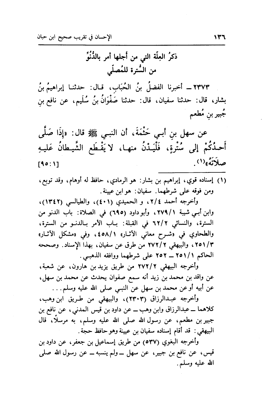 2373 - أَخْبَرَنَا الْفَضْلُ بْنُ الْحُبَابِ، قَالَ: حَدَّثَنَا إِبْرَاهِيمُ بْنُ بَشَّارٍ، قَالَ: حَدَّثَنَا سُفْيَانُ، قَالَ: حَدَّثَنَا صَفْوَانُ بْنُ سُلَيْمٍ، عَنْ نَافِعِ بْنِ جُبَيْرِ بْنِ مُطْعِمٍ، عَنْ سَهْلِ بْنِ أَبِي حَثْمَةَ، أَنَّ النَّبِيَّ صَلَّى اللَّهُ عَلَيْهِ وَسَلَّمَ قَالَ: «إِذَا صَلَّى أَحَدُكُمْ إِلَى سُتْرَةٍ فَلْيَدْنُ مِنْهَا، لَا يَقْطَعِ الشَّيْطَانُ عَلَيْهِ صَلَاتَهُ» (¬1) . [1: 95]