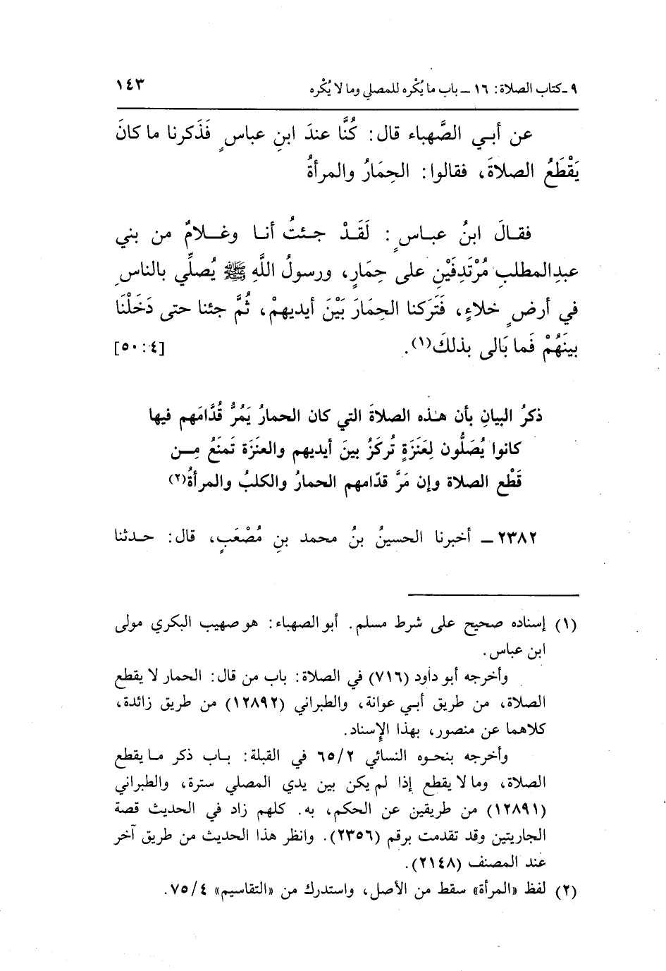 عَنْ أَبِي الصَّهْبَاءِ، قَالَ: كُنَّا عِنْدَ ابْنِ عَبَّاسٍ، فَذَكَرْنَا مَا كَانَ يَقْطَعُ الصَّلَاةَ، فَقَالُوا: الْحِمَارُ وَالْمَرْأَةُ، فَقَالَ ابْنُ عَبَّاسٍ: «لَقَدْ جِئْتُ أَنَا وَغُلَامٌ مِنْ بَنِي عَبْدِ الْمُطَّلِبِ مُرْتَدِفِينَ عَلَى حِمَارٍ، وَرَسُولُ اللَّهِ صَلَّى اللَّهُ عَلَيْهِ وَسَلَّمَ يُصَلِّي بِالنَّاسِ فِي أَرْضِ خَلَاءٍ، فَتَرَكْنَا الْحِمَارَ بَيْنَ أَيْدِيهِمْ، ثُمَّ جِئْنَا حَتَّى دَخَلْنَا بَيْنَهُمْ فَمَا بَالَى بِذَلِكَ» (¬1) . [4: 50]